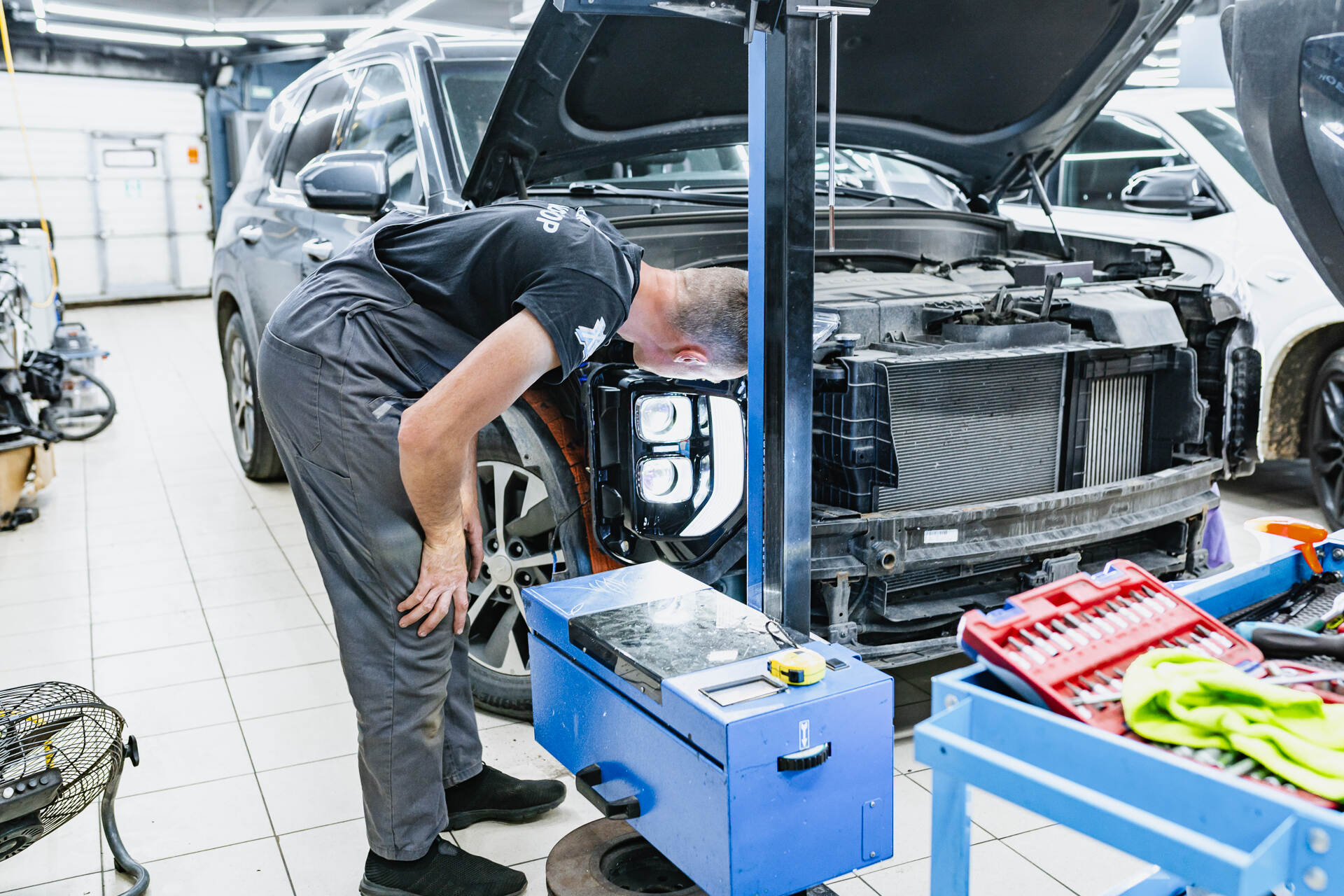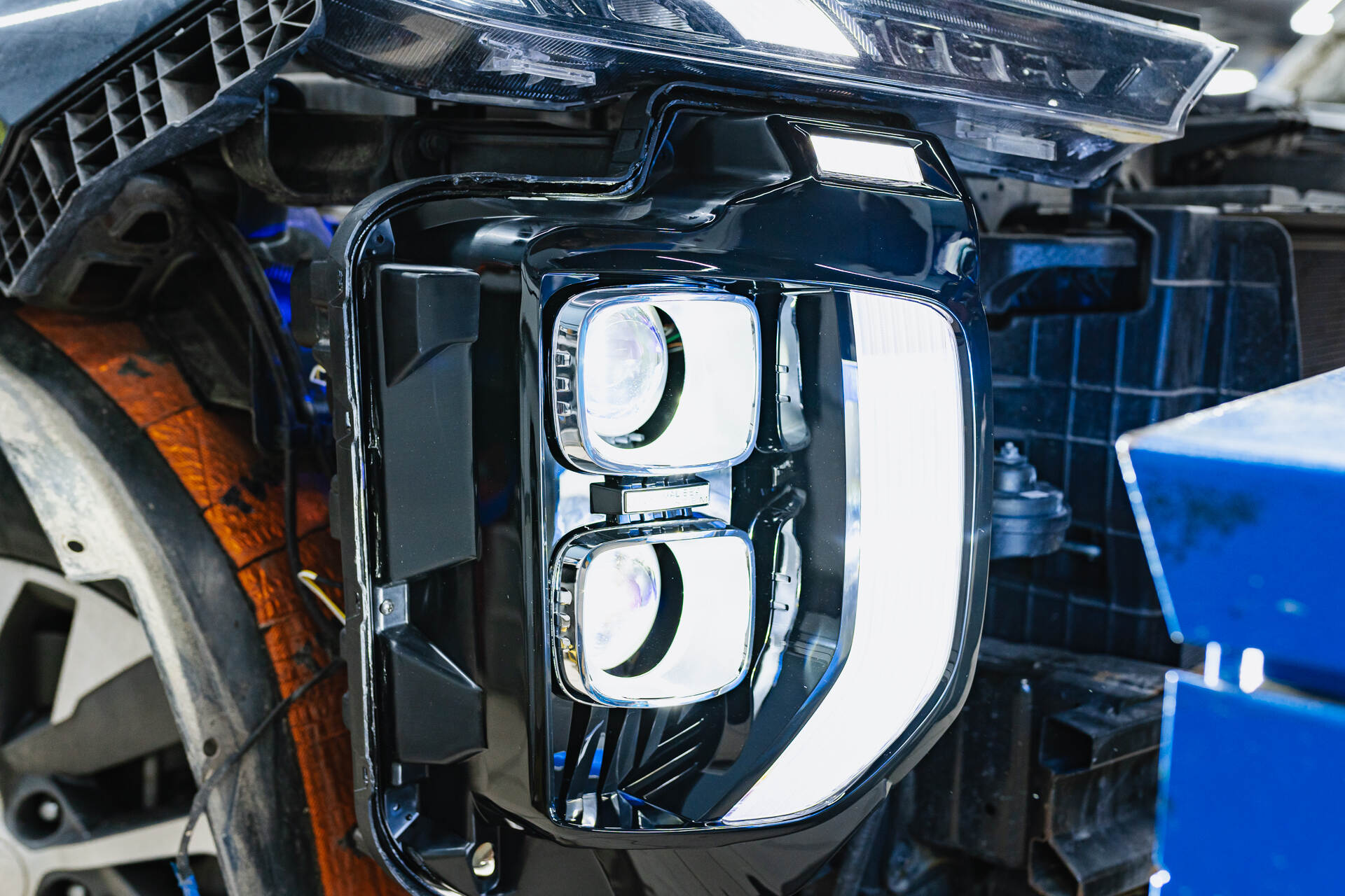 Примеряем фары с новыми линзами до герметизации. Герметизируем фары.Перед окончательной герметизацией мы устанавливаем фары с новыми линзами на Hyundai Palisade для точной настройки положения модулей Vision Tri-led Ultimate Series 5500K и примерки декоративных масок. После этого фары снимаются снова и проходят процедуру герметизации с применением термостойкого бутилового герметика, а когда герметик полностью полимеризуется, фары возвращаются окончательно на автомобиль, где мы полируем их внешние стекла до кристального блеска, удаляя большую часть мелких царапин и следов абразивного износа. Завершающим этапом становится профессиональная регулировка головного света с помощью оптического прибора, позволяющая добиться четкой и ровной светотеневой границы. Дополнительно забронируем отполированные фары полиуретановой плёнкой для их защиты.
