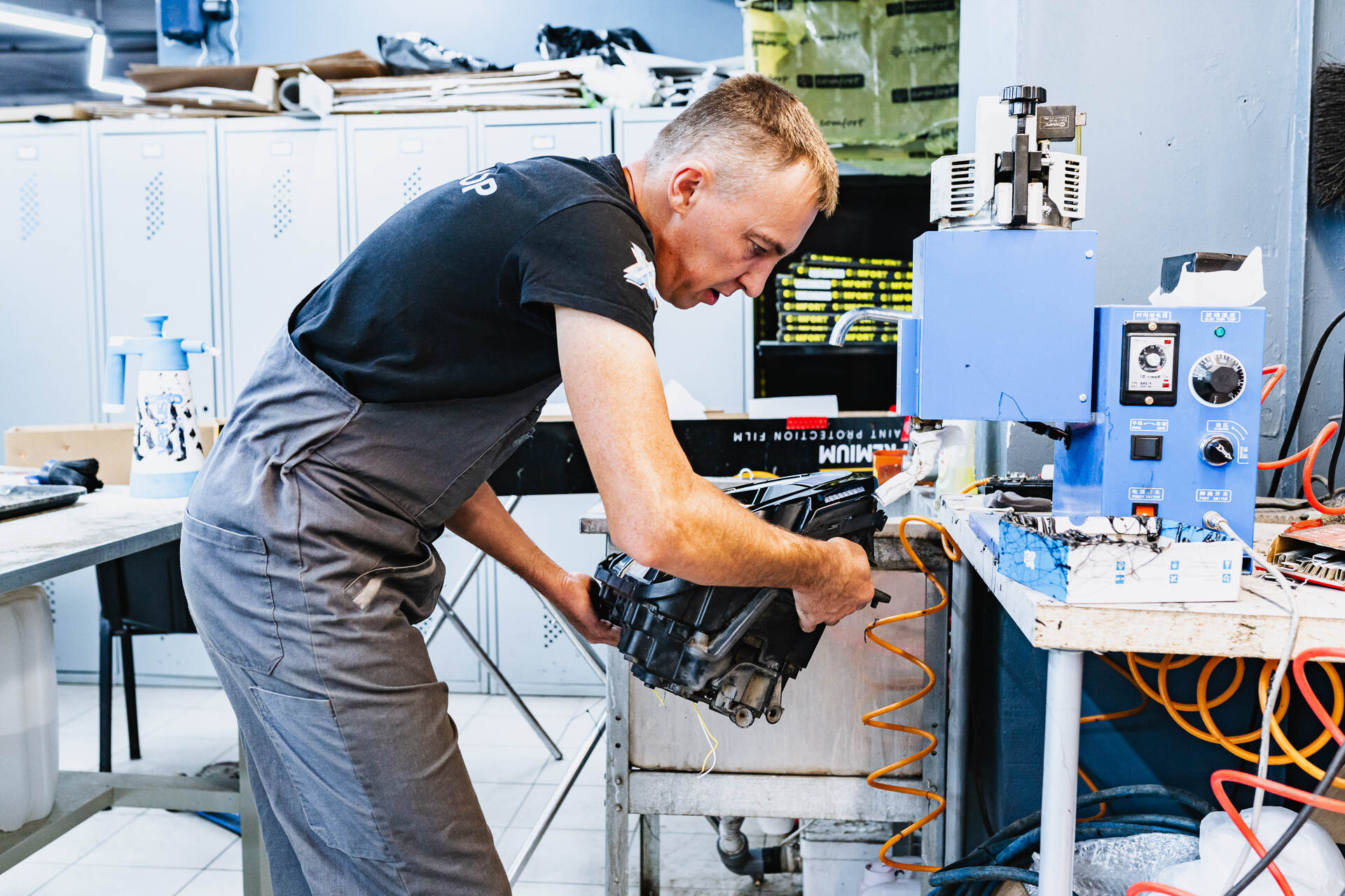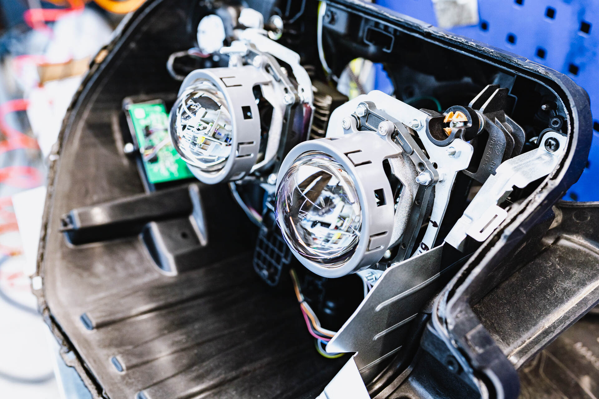 Разбираем фары. Устанавливаем новые линзы в фары.Для замены линз в фарах Хендай Палисад требуется демонтировать переднюю часть автомобиля. Мы снимаем бампер, затем обе фары и отправляем их на разборку. После этого извлекаются штатные линзы ближнего и дальнего света, на место которых монтируются новые светодиодные модули Vision Tri-led Ultimate Series 5500K. Для установки используются специальные переходные рамки, что позволяет обойтись без кардинальной доработки штатных посадочных мест — вся замена происходит максимально приближенно к заводскому исполнению. В процессе работы мы также тщательно очищаем внутренние поверхности стекол фар щелочным раствором, поскольку загрязнения образуются не только снаружи – это повышает светопропускание, позволяя новым линзам работать без потерь яркости и искажений светового пучка.