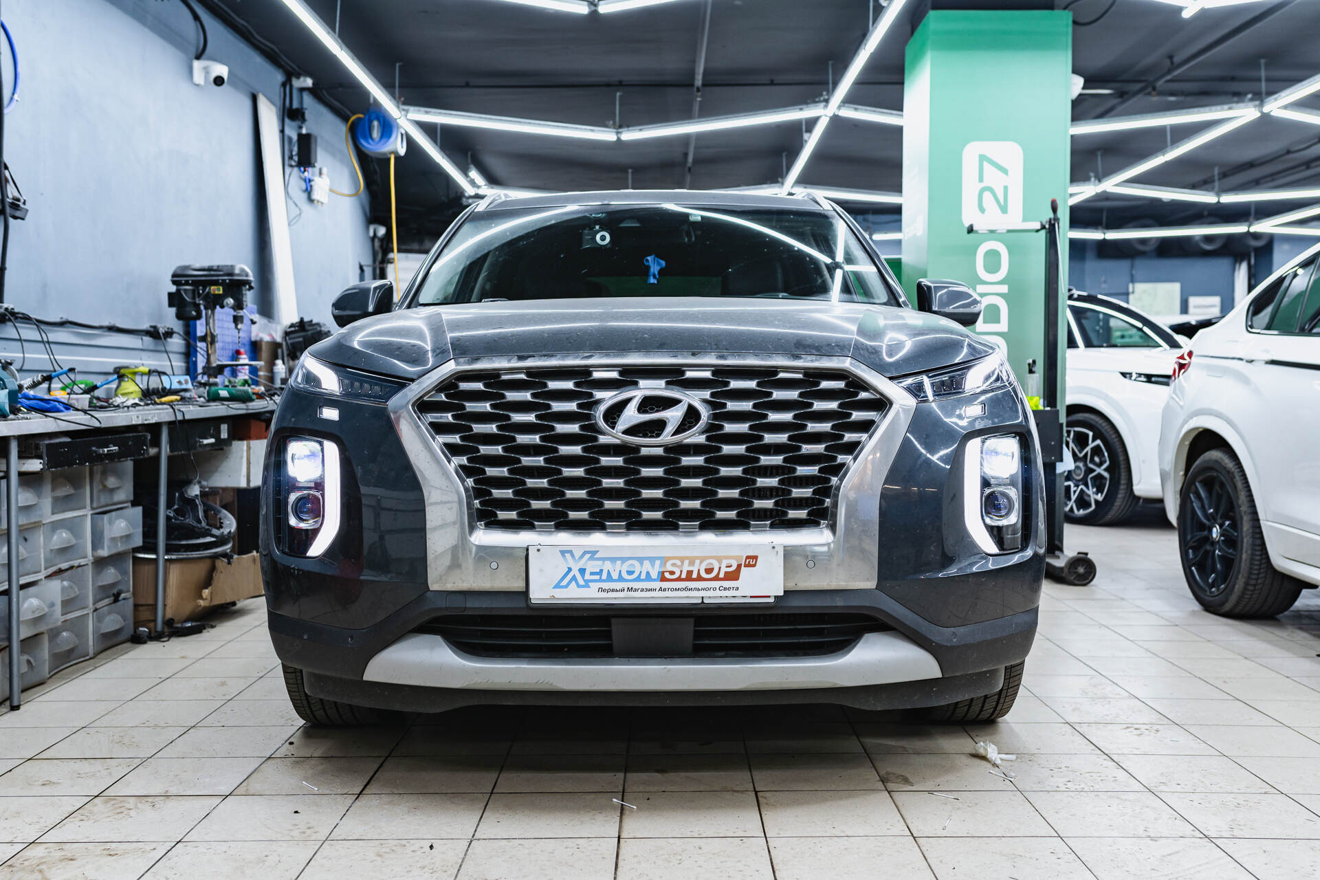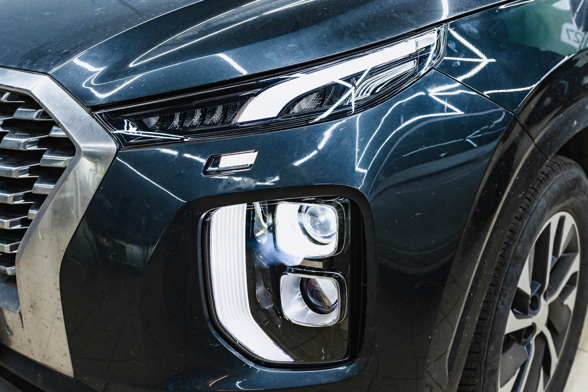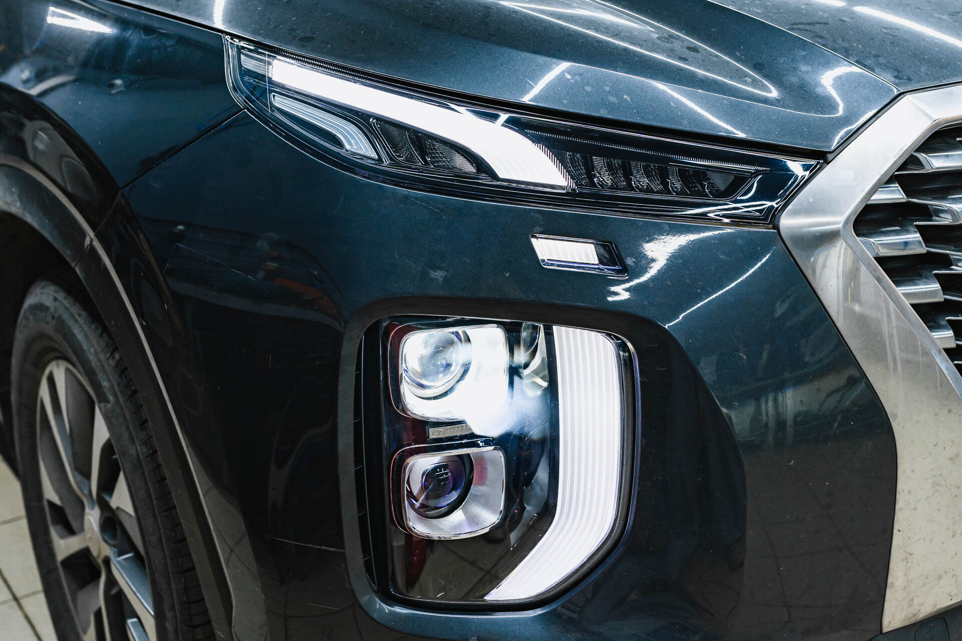 Полируем стекла фар и наносим на них защитную пленку.Взгляните на итоговые фотографии: как видно, автомобиль Hyundai Palisade с четырьмя линзами Vision Tri-led Ultimate Series 5500K получил поистине огромное количество света, сохраняя при этом чистый белый оттенок без посторонних примесей синевы или желтизны. Мощный свет фар не только значительно повышает комфорт и безопасность ночных поездок, но и придает автомобилю особый стиль, создавая выразительный контраст с темным кузовом. Важно отметить, что низкая боковая засветка новых линз не будет слепить встречных автомобилистов, напротив, яркий головной свет значительно увеличивает безопасность поездок в темное время суток.