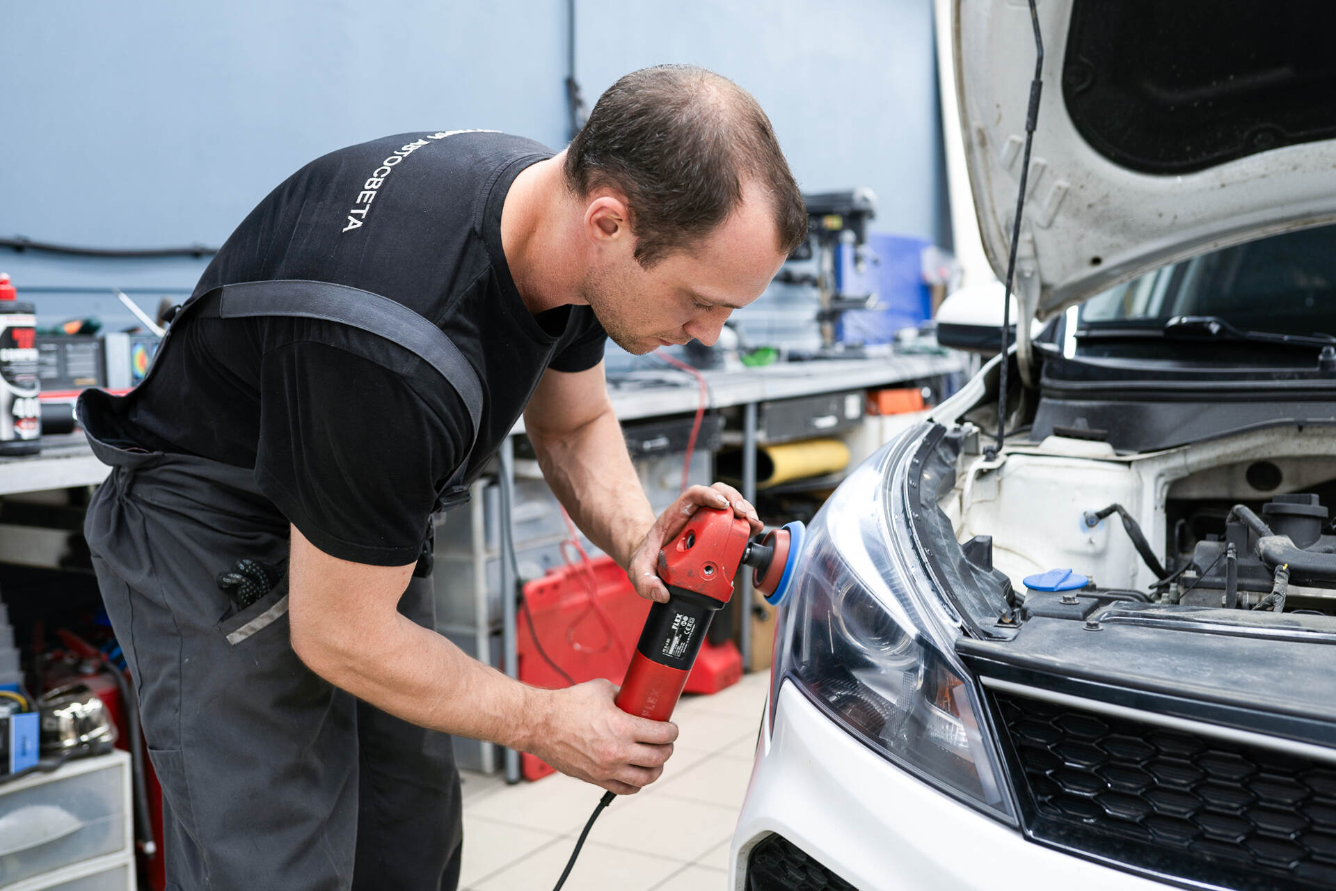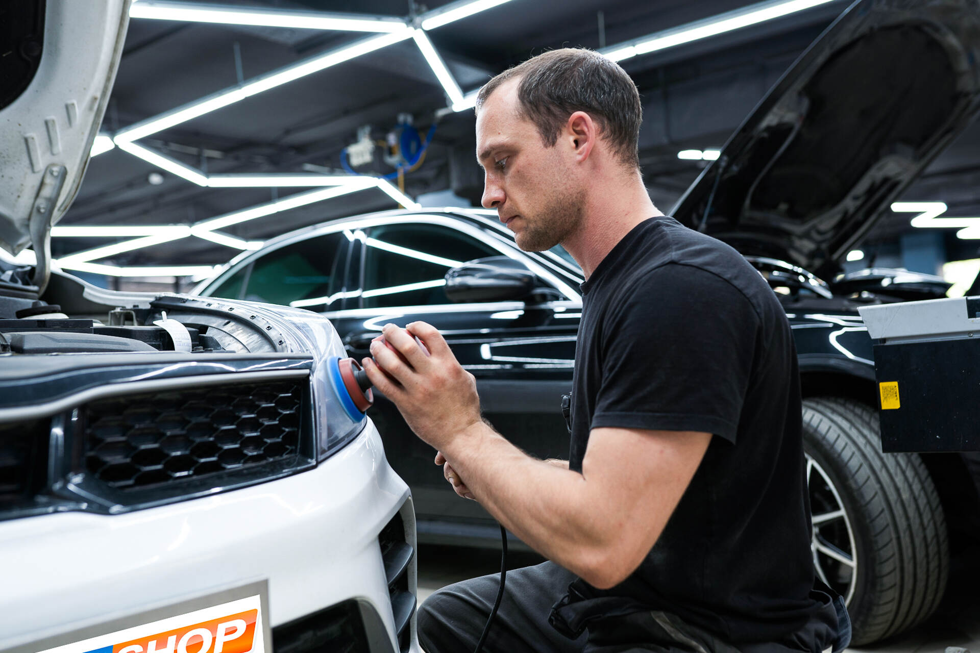 Регулируем положение линз до герметизации фар. Чистим стёкла, герметизируем фары и полируем стёкла фар.Одновременно с установкой линз в фары мы также отчистили стёкла фар изнутри щелочью, чтобы вернуть им былую прозрачность. Перед герметизацией фары временно устанавливаются на KIA Rio X-Line для точной настройки положения светодиодных линз Vision TRI-LED Ultimate Series Soft 4800K. С помощью высокоточного прибора корректно выставляем модули относительно горизонта, что позволяет сформировать безупречно ровную светотеневую границу. После регулировки фары демонтируются для окончательной герметизации бутиловым герметиком. Завершающим этапом становится полировка стекол, устраняющая мелкие дефекты поверхности. Эта процедура не только улучшает внешний вид, но и обеспечивает максимальное светопропускание без оптических искажений.