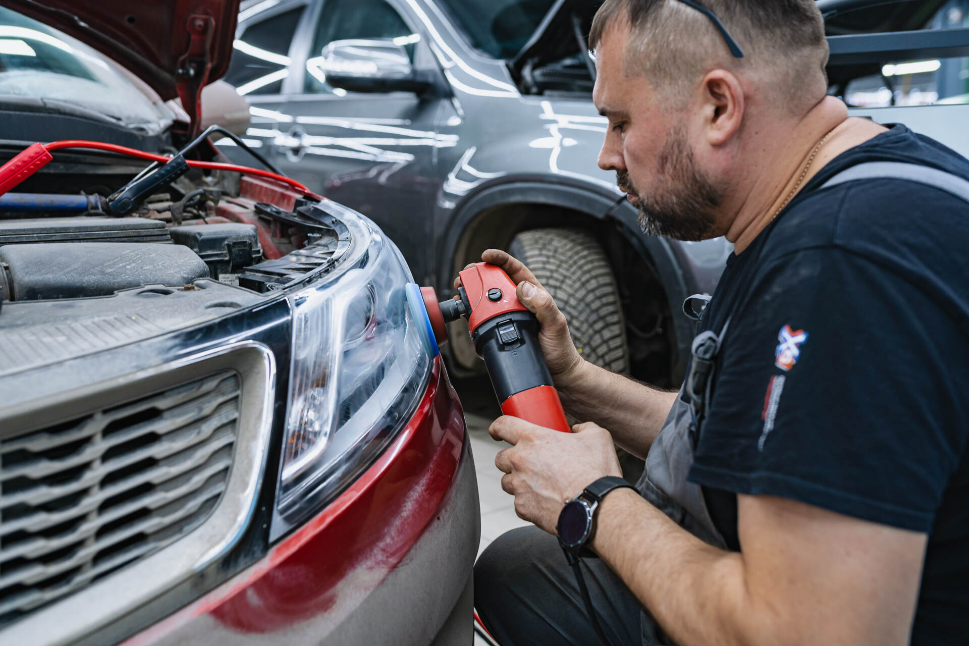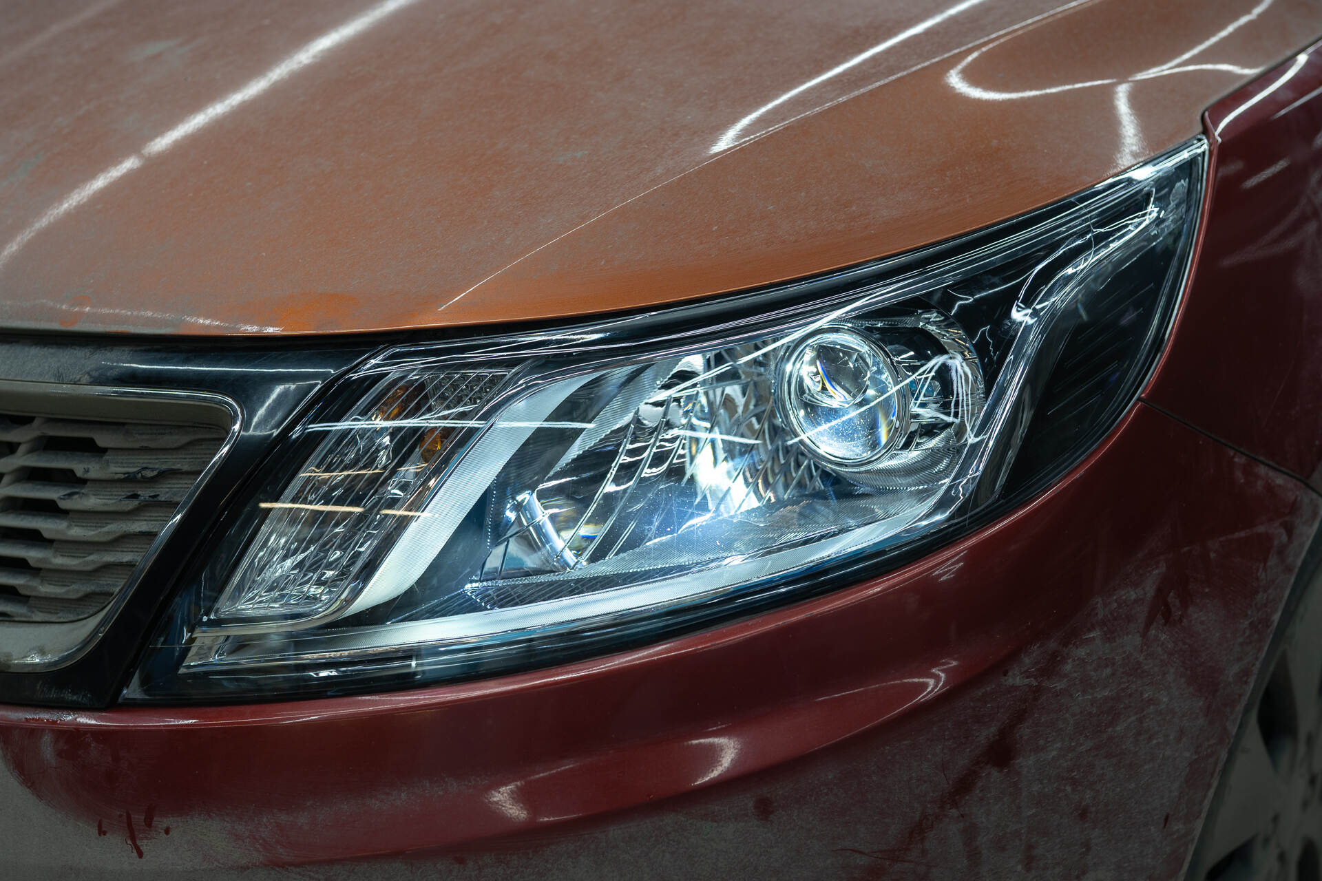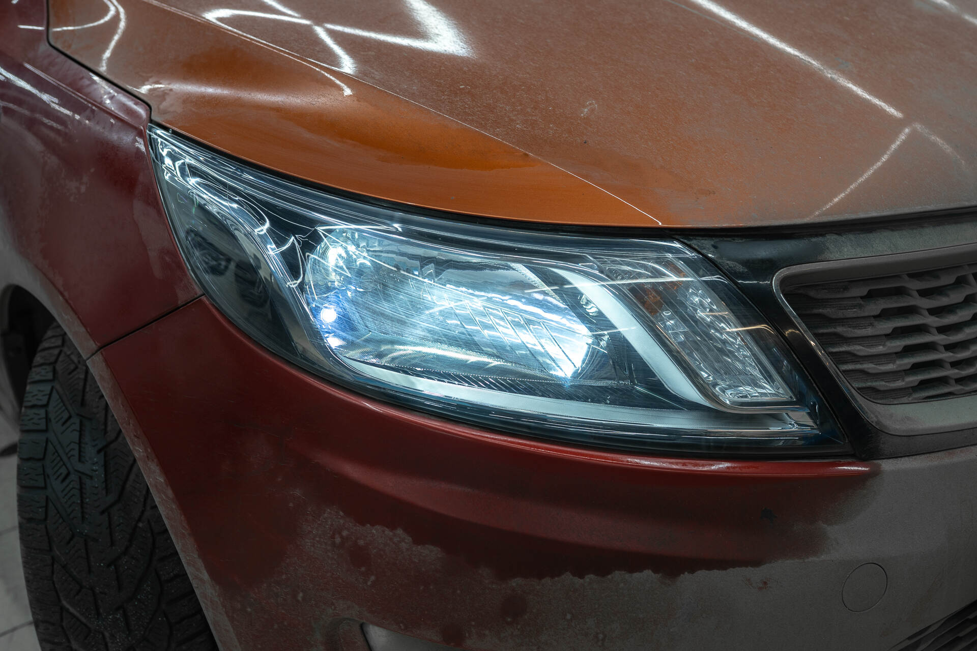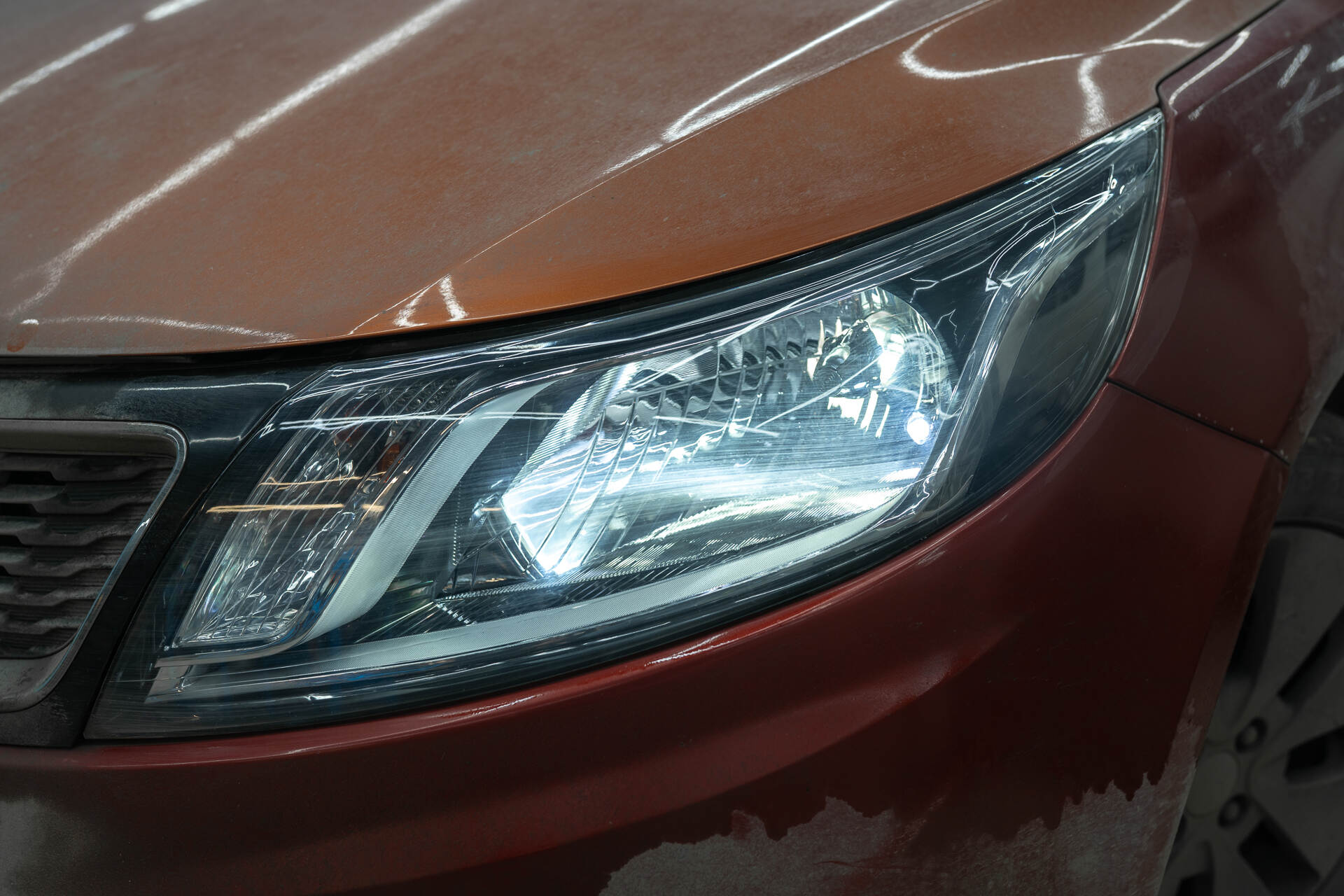 Полируем фары с внешней стороны.Перед герметизацией фары возвращаются на автомобиль для точной регулировки света и примерки декоративных масок. А уже после настройки света фары собираются на базе надежного бутилового герметика, а затем осуществляется уже финальная сборка автомобиля. Завершающим этапом становится корректировка новых LED-линз по прибору и внешняя полировка стекол абразивными пастами. Такая полировка эффективно устраняет мелкие царапины и потертости от пескоструя, обеспечивая идеальную прозрачность и максимально качественный световой поток на выходе, повышая эффективность головного света до максимума.