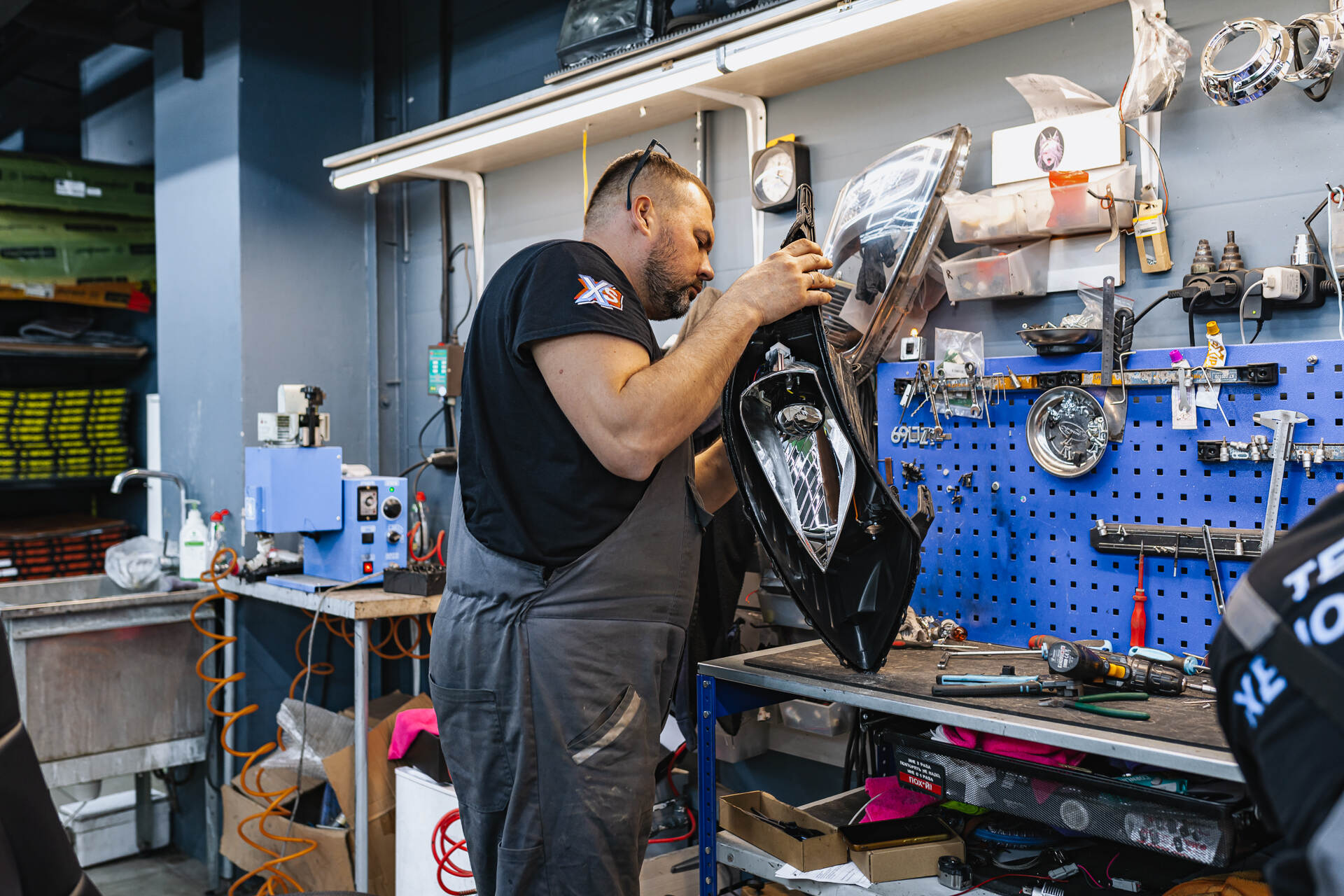 Удаляем из пазов корпуса старый герметик и корректируем форму клиентских линз пилой перед установкой. Установка линз в фары Киа Рио.Установка линз в фары КИА Рио занимает один рабочий день: приняв автомобиль утром, мы обычно возвращаем его владельцу с новым автосветом уже к вечеру. Сам по себе процесс начинается с демонтажа бампера и фар, которые отправляются в промышленную печь на разгерметизацию. После разбора фар мы извлекаем из них отражатели, в которых выпиливаем отверстия для установки новых светодиодных линз с использованием шпилек. Параллельно мы тщательно очищаем внутреннюю поверхность стекол щелочным составом, устраняя налет и застарелую грязь, что существенно повышает прозрачность фар и эффективность светового потока.