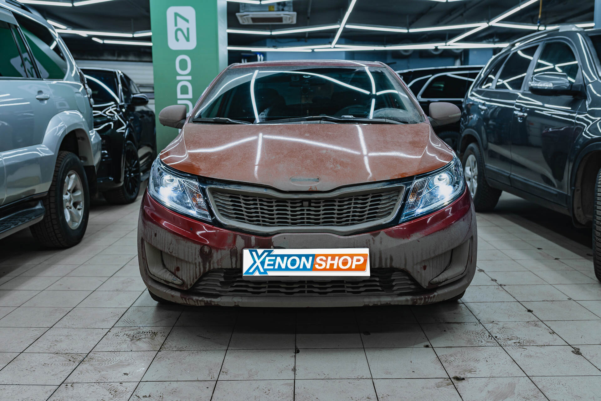 Исходный свет и вид фар и автомобиля до установки линз.Для кардинального преображения света KIA Rio мы интегрируем в рефлекторную оптику безымянные светодиодные линзы, которые привез с собой владелец авто – мы работаем с любым оборудованием; вы можете привезти линзы, лампы или стекла фар с собой, либо заказать всё необходимое у нас – в нашем ассортименте всегда в наличии самые ходовые запчасти для тюнинга головного света (чаще всего мы рекомендуем LED-линзы MTF или Vision). А наш огромный опыт установки LED-модулей позволяет нам гарантировать высокое качество работы и достойный итоговый результат, сопровождая каждую выполненную работу годовой гарантией.
