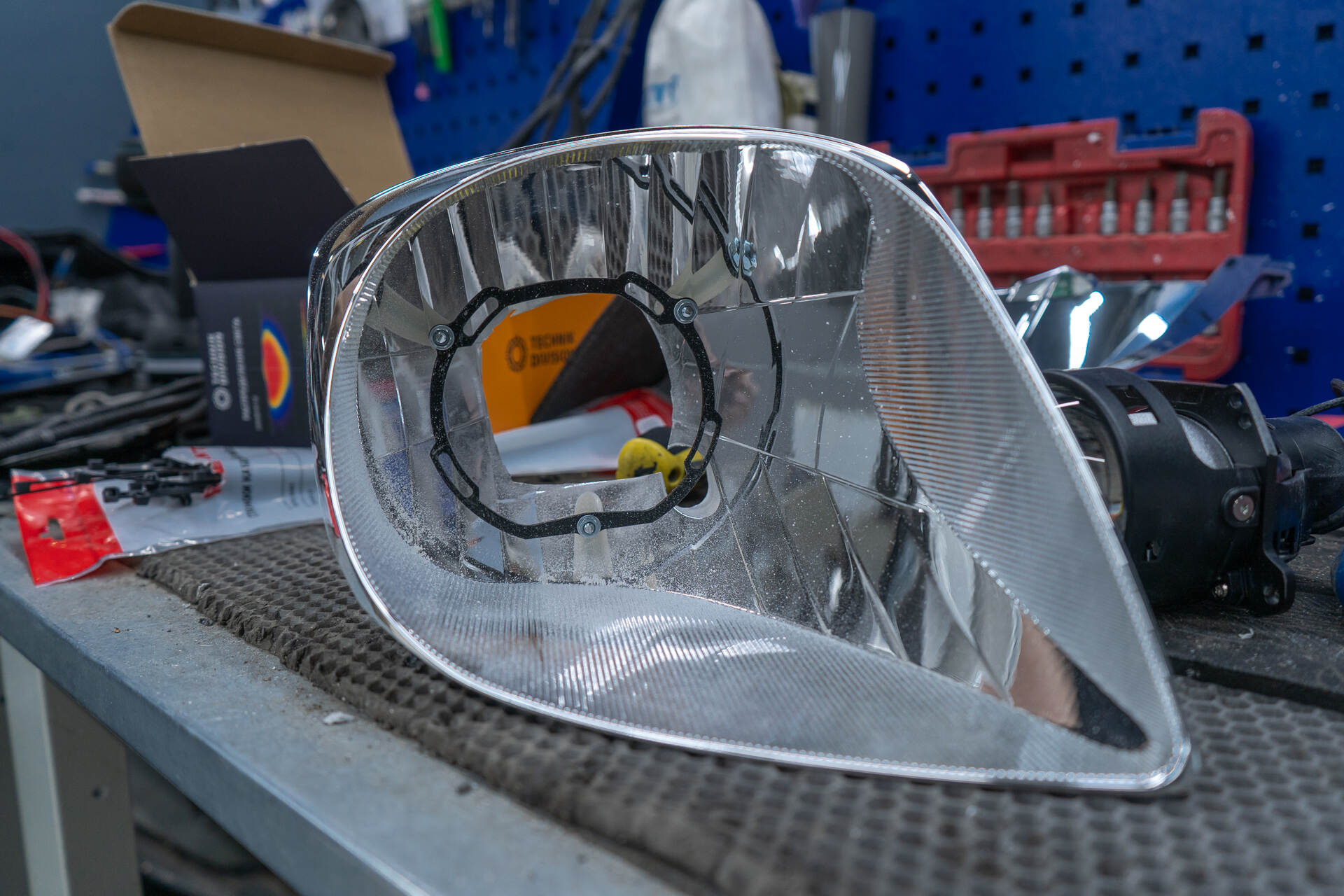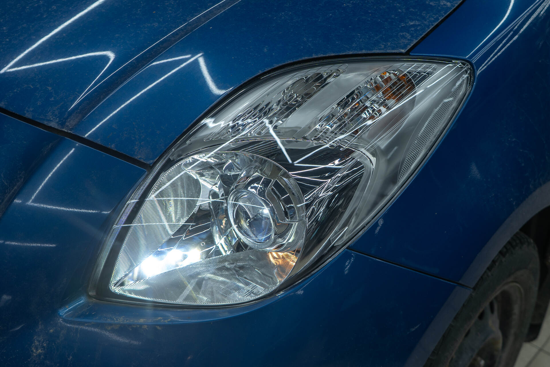 Герметизируем фары с новыми стеклами и собираем автомобиль. Регулировка нового автосвета.Установка линз на Тойота Ярис начинается с демонтажа фар, далее мы отправляем фары на разборку. Следующим шагом извлекаем из фар отражатели, в которых необходимо подготовить посадочное место пилой, куда с помощью переходных рамок монтируются билинзы Technik Division Pro 3". Перед финальной сборкой фары возвращаются на автомобиль для точной калибровки светового потока и примерки декоративных масок (бленд). Завершающим этапом становится повторный демонтаж и герметизация фар.