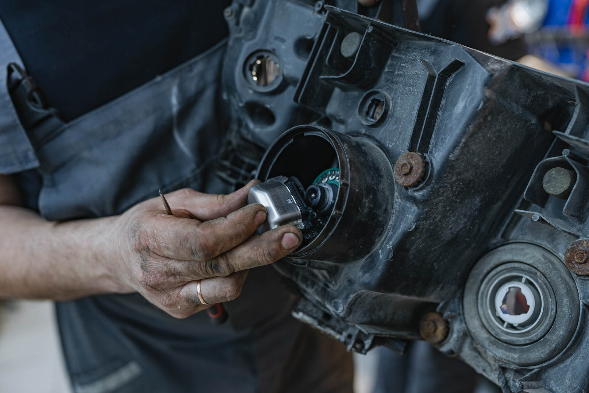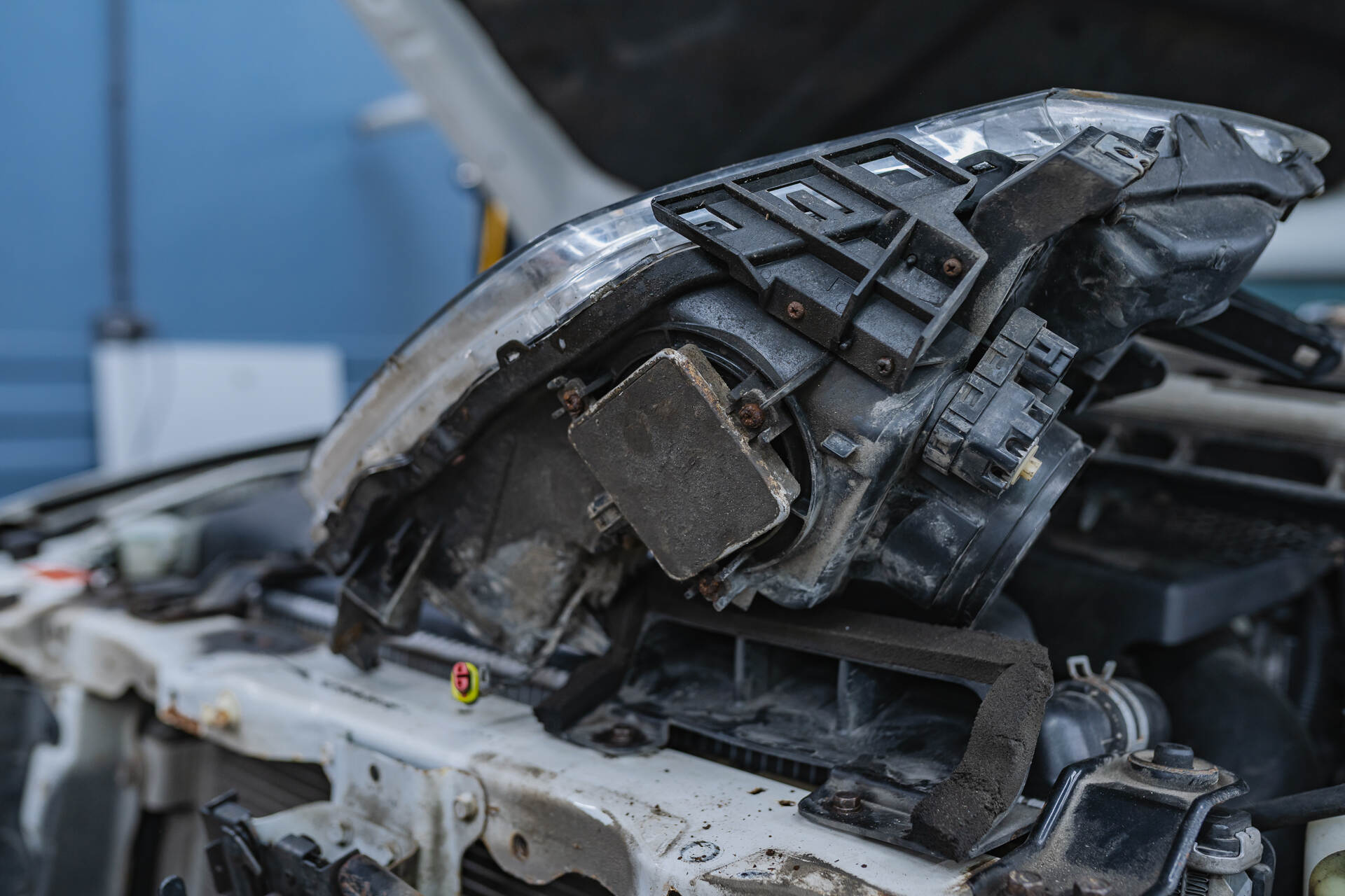 Демонтаж фары и сгоревшего блока розжига штатного ксенона. Установка нового блока розжига на фару.Замены ксенонового блока розжига Митсубиси Паджеро 4 не требует чересчур много времени и в среднем занимает около двух-трех часов. Основная сложность здесь заключается в тонкой работе с электрикой: крайне важно обеспечить корректное подключение, чтобы исключить возникновение помех в бортовой сети и нестабильное свечение ксенона. Работа выглядит следующим образом: сначала мы аккуратно разбираем переднюю часто авто и снимаем потухшую фару, после чего извлекаем вышедший из строя блок розжига и устанавливаем на его место новый оригинальный ксеноновый блок Mitsubishi W3T23371, W3T21571.