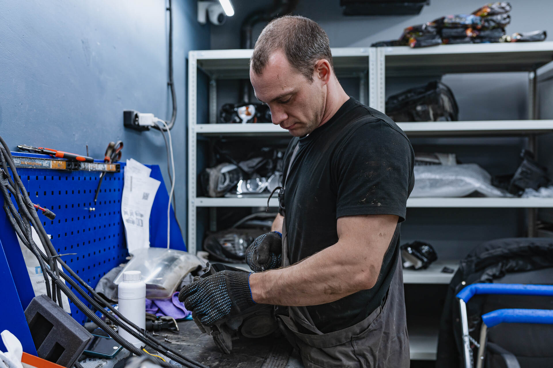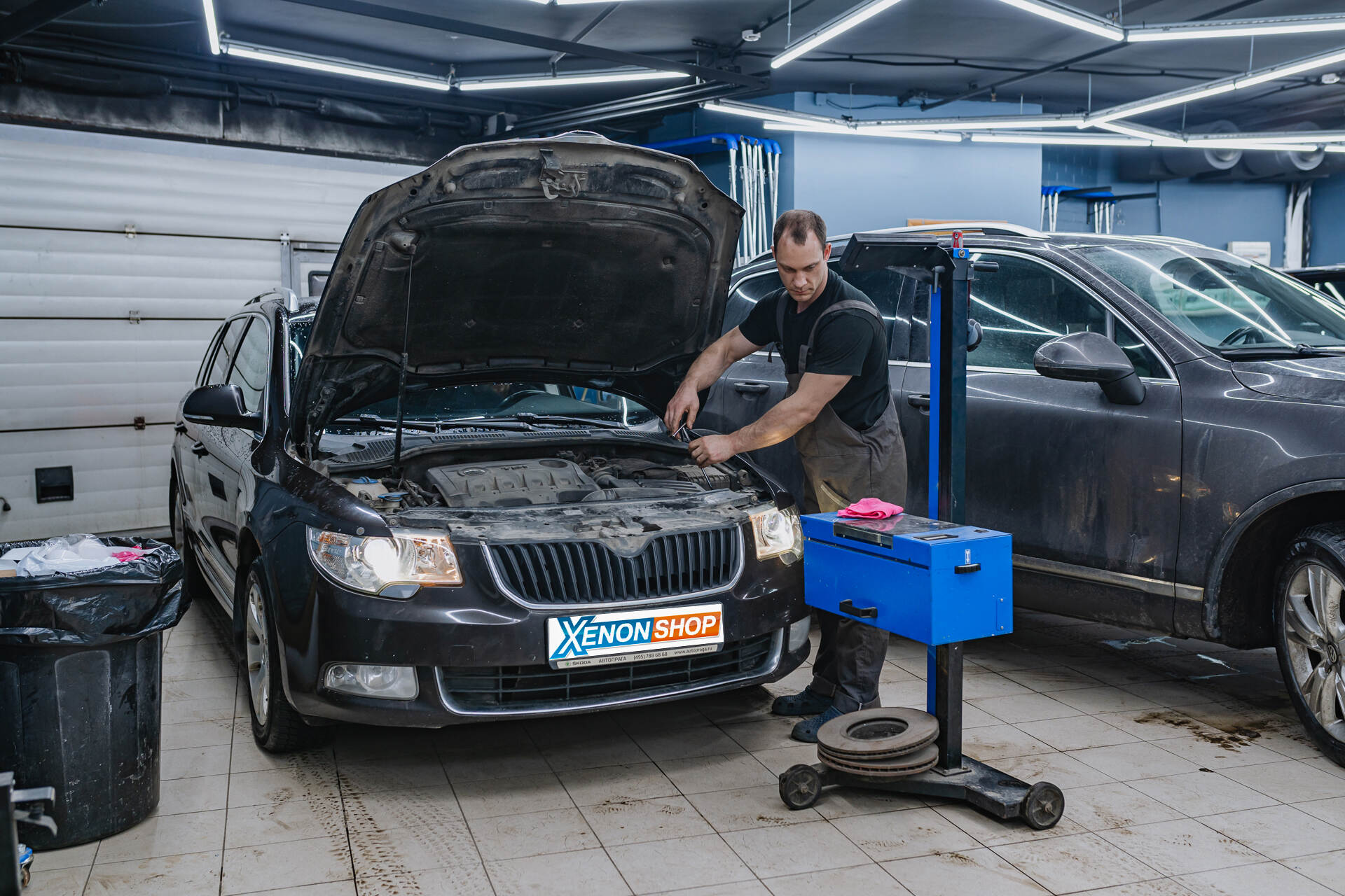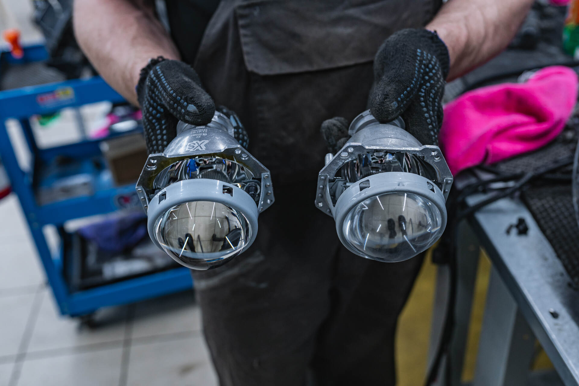 Сборка автомобиля и регулировка обновлённого головного света.Замена линз Шкода Суперб занимает около суток из-за сложности разбора фар, которые на заводе собираются с применением неплавкого стекольного герметика. Процесс начинается с демонтажа бампера и извлечения фар для их последующего вскрытия. После удаления выгоревших штатных модулей мы интегрируем в фары биксеноновые линзы XS-Light 3R Premium, используя специализированные переходные рамки для точной фиксации. Параллельно с установкой новой оптики выполняется глубокая очистка внутренней поверхности стекол фар щелочным составом, что позволяет полностью устранить накопленный годами налет и грязь