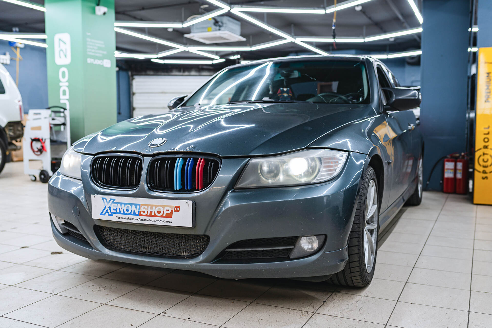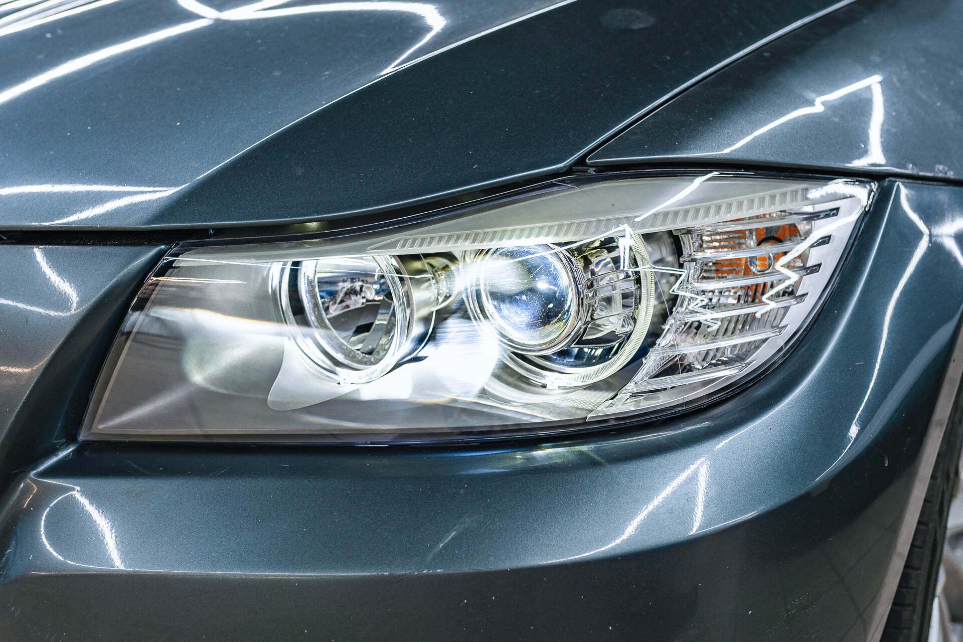 Исходный свет фар и вид автомобиля в момент обращения.В рамках данного проекта мы выполним замену штатных ксеноновых линз в фарах BMW 3 E90 (2009) на современные светодиодные модули Vision TRI-LED Ultimate Series Soft. Эти линзы создают световой пучок белого света с цветовой температурой 4800K. Все больше автовладельцев отказываются от характерной для старых фар желтизны в пользу более эстетичного и современного белого света. Представленные светодиодные модули отличаются продуманной конструкцией и надежной сборкой: мы уже достаточно давно работаем с ними, и от клиентов, кому мы их устанавливали не поступало жалоб на качество работы. Кроме того, не будем забывать и про гарантию: два года на сами линзы и один год на работы по их установке.