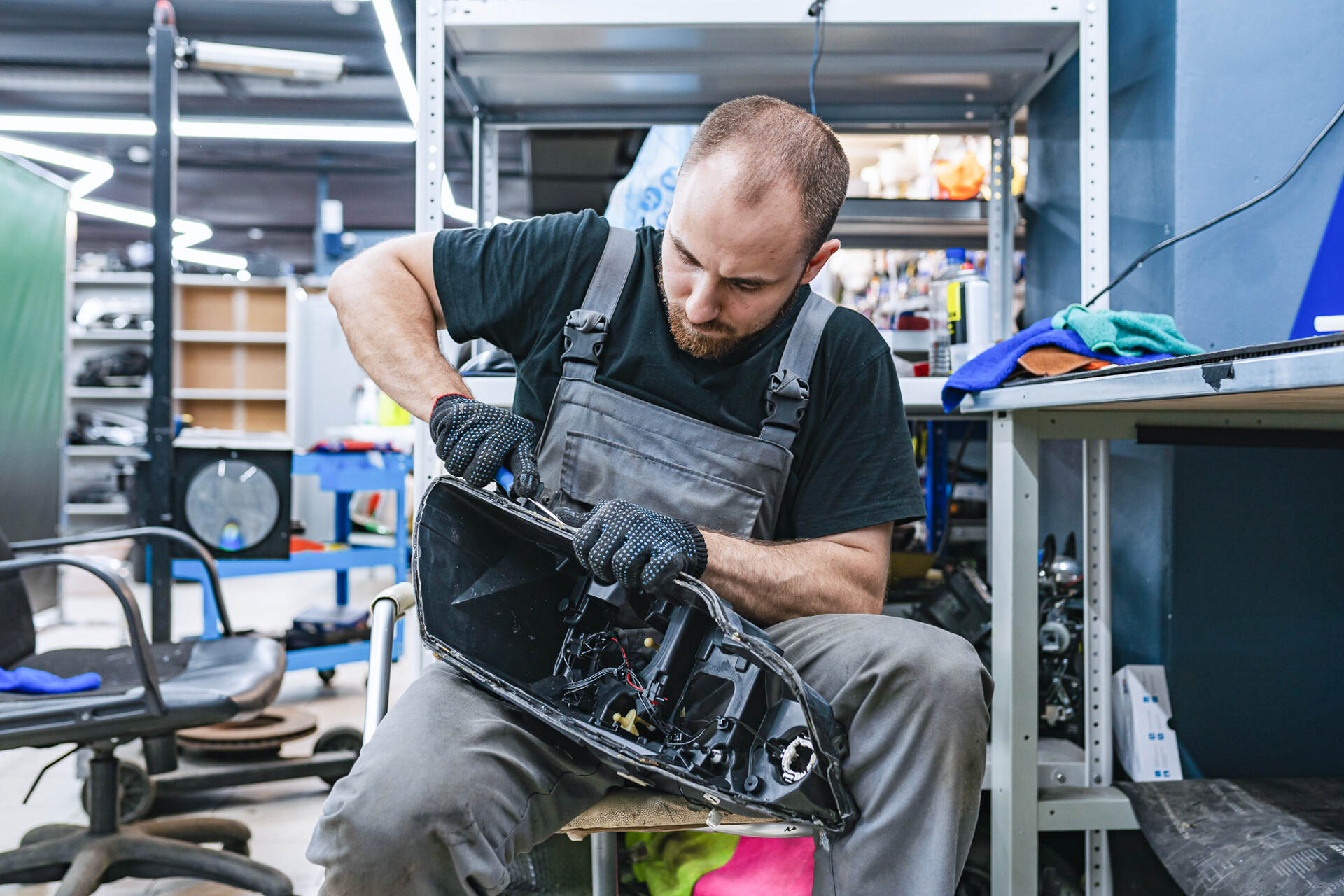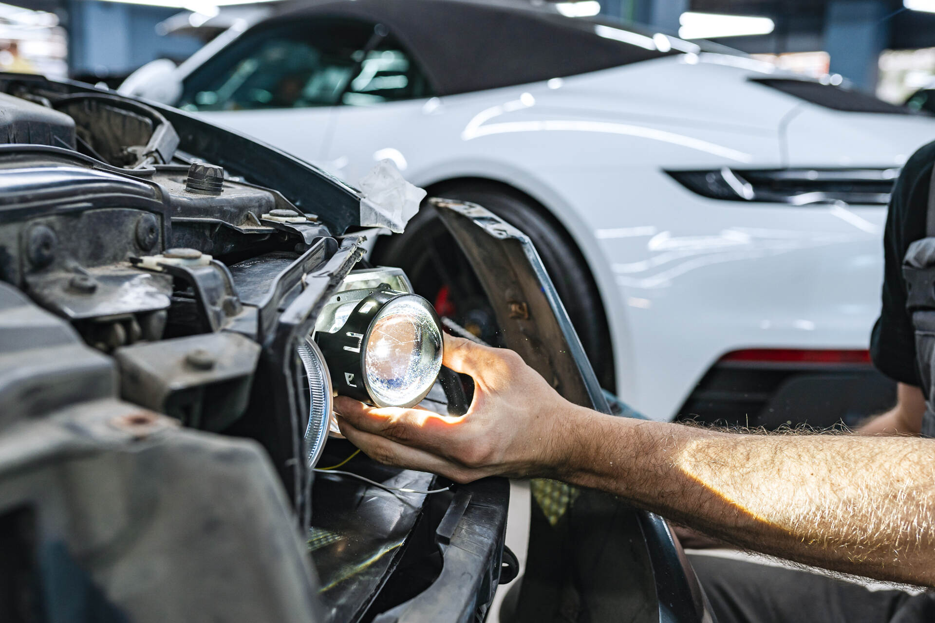 Демонтаж фар с автомобиля. Дефектовка и разбор фар.Замена линз в фарах на БМВ 3 Е90 занимает в среднем около одних суток, но фактическая продолжительность работ зависит от текущей загрузки нашей мастерской. В связи с этим дата завершения может корректироваться — этот вопрос мы всегда согласовываем индивидуально с каждым клиентом. Работа по замене линз начинается с разборки передней части автомобиля: снимаем бампер, после чего извлекаем обе фары. Разборка фар выполняется вручную, поскольку производитель использовал стекольный герметик, не поддающийся размягчению в промышленной печи. После разборки мы извлекаем штатные ксеноновые линзы и устанавливаем светодиодные модули Vision TRI-LED Ultimate Series Soft. Монтаж осуществляется с помощью специальных переходных рамок, что позволяет обойтись без серьёзных доработок посадочного места.