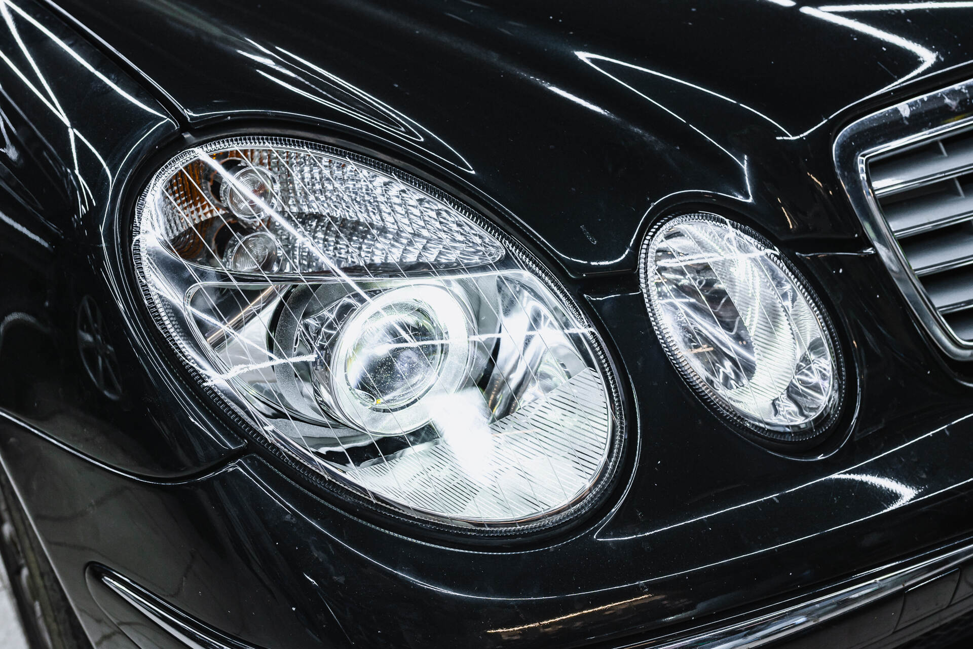 Вид автомобиля после работы.Следует подчеркнуть, что в момент обращения автомобиля ближний свет практически отсутствовал — такая ситуация для нас привычна, поскольку к нам часто обращаются владельцы с неработающей оптикой. Однако после установки линз MTF-Light MaxBeam 2.0 фары Mercedes-Benz E W211 (2003) начали излучать интенсивный белый свет, КАЧЕСТВЕННО превосходящий исходные показатели, демонстрирующий высокую плотность светового луча и его равномерным распределением по дорожному полотну — такое освещение эффективно рассеивает темноту перед автомобилем, обеспечивая необходимый уровень безопасности для водителя и пассажиров во время ночных поездок. Визуальный облик автомобиля также претерпел положительные изменения: яркое белое свечение фар выгодно контрастирует с черным кузовом, создавая элегантный и солидный образ.