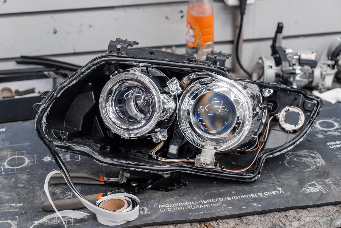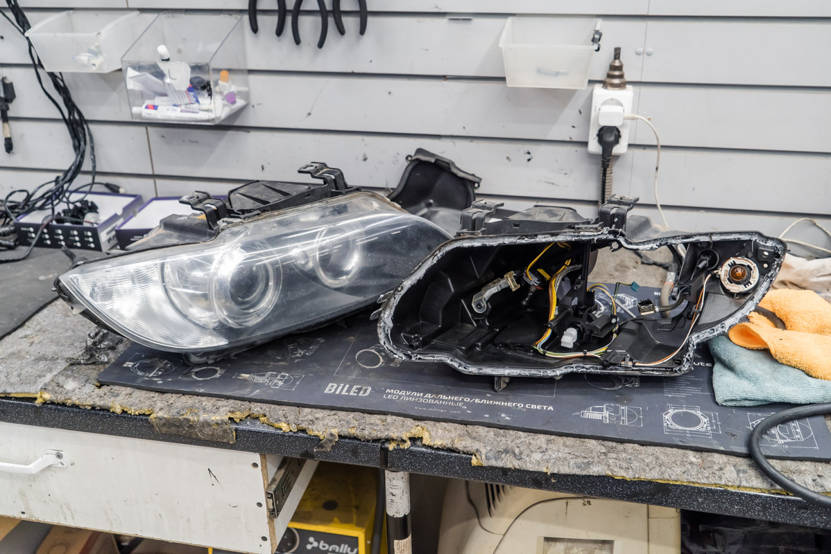Установка новых линз в фары. Собираем фары с новыми стёклами.Замена линз на БМВ М3 Е92 занимает полные сутки, так как заводской стекольный герметик не поддается нагреву в печи, что делает фары «неразборными» и требует кропотливого ручного вскрытия. Процесс начинается с демонтажа бампера и извлечения фар, после чего мастера аккуратно отделяют стекла и удаляют выгоревшие линзы, на их место устанавливается современный биксенон XS-Light 3R Premium. Использование специальных переходных рамок позволяет закрепить новые линзы в штатных гнездах без доработки конструкции, сохраняя целостность посадочных мест.
