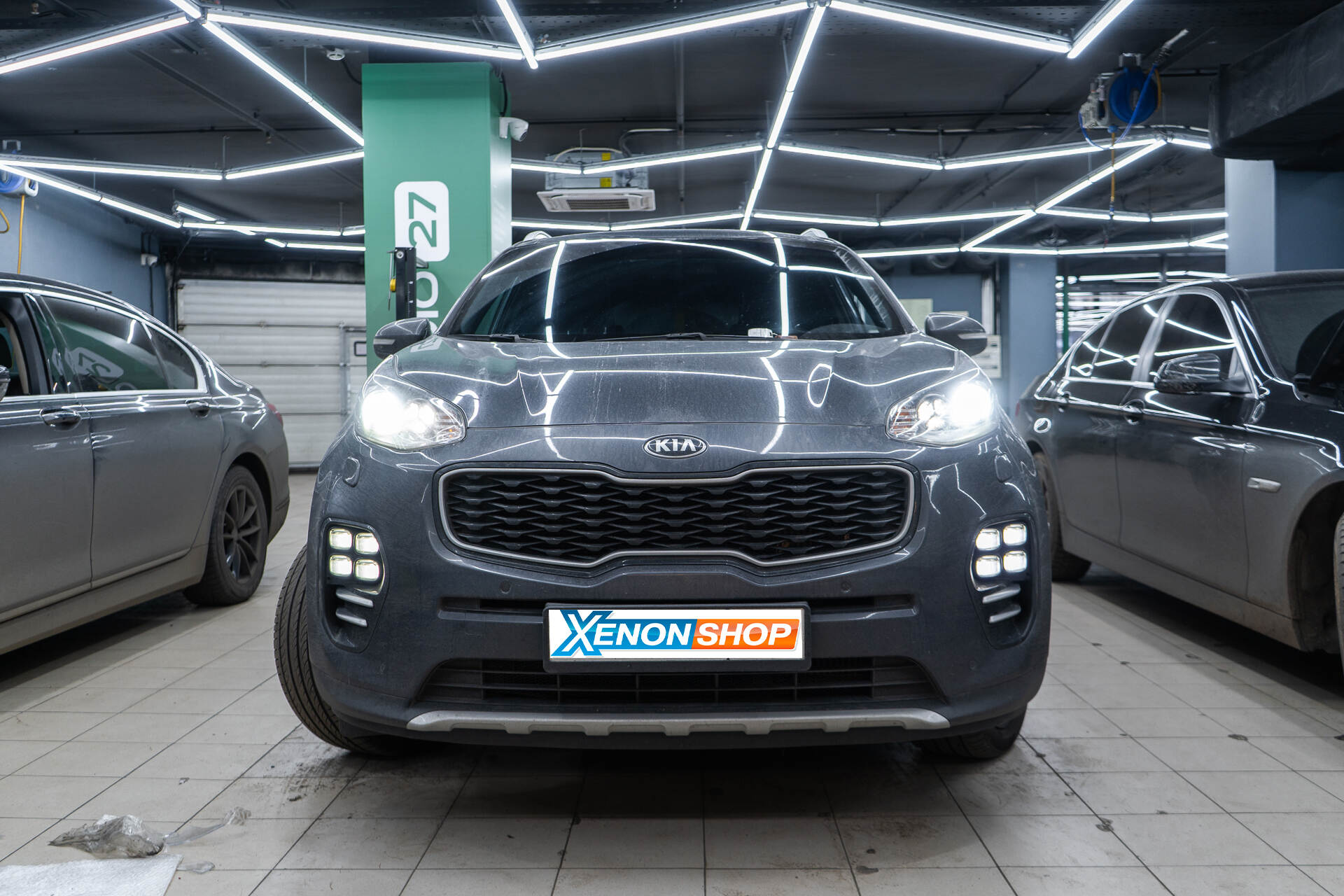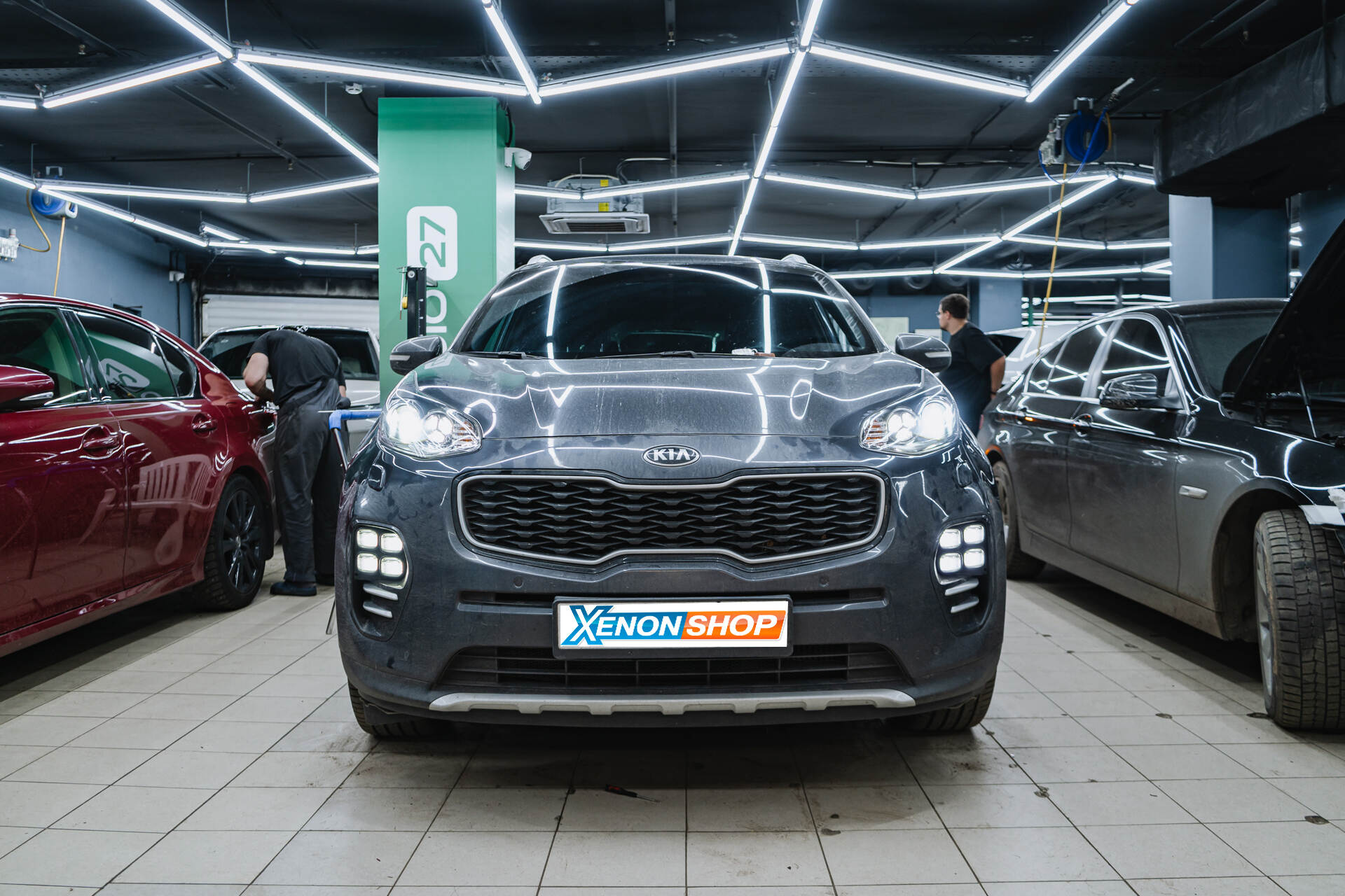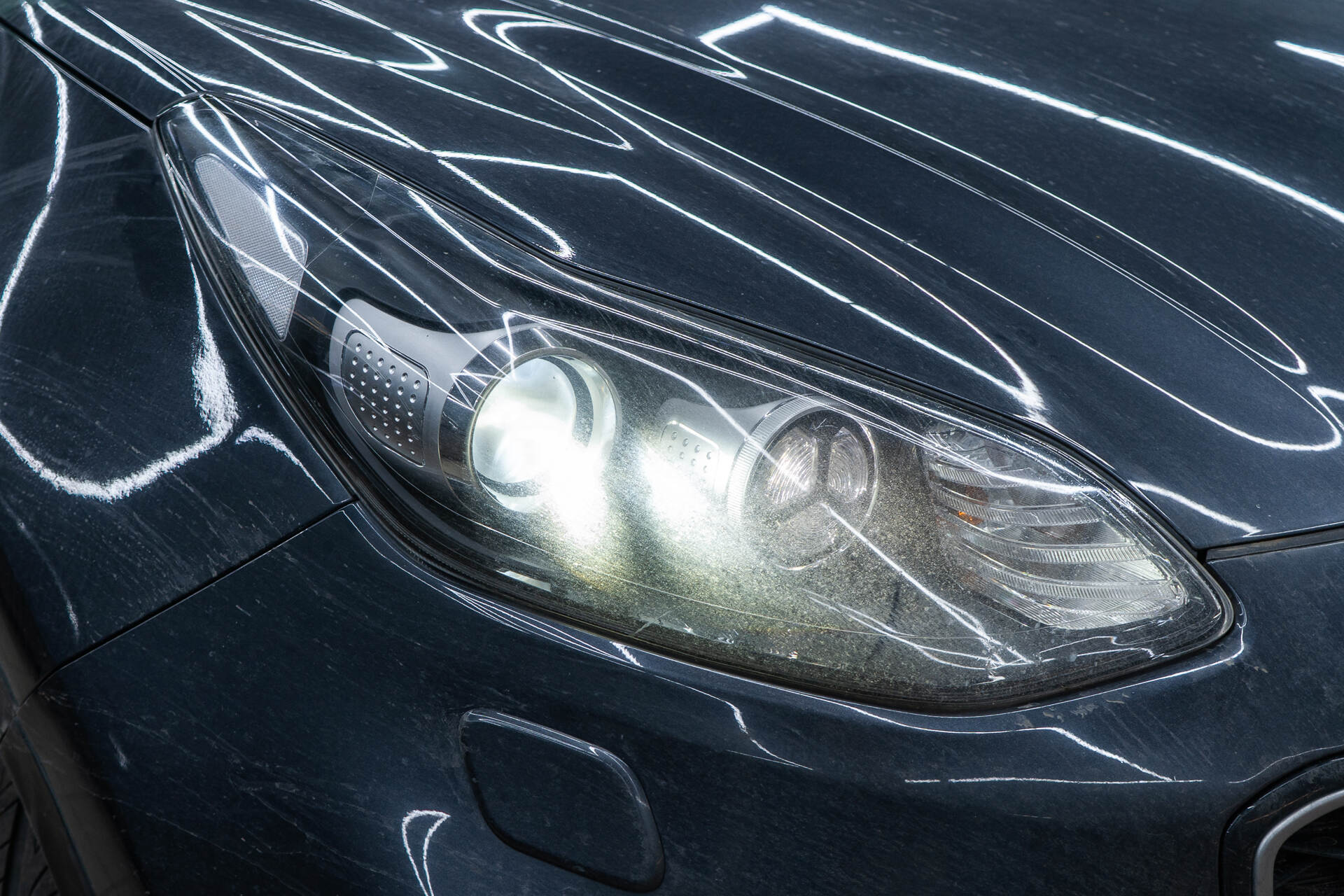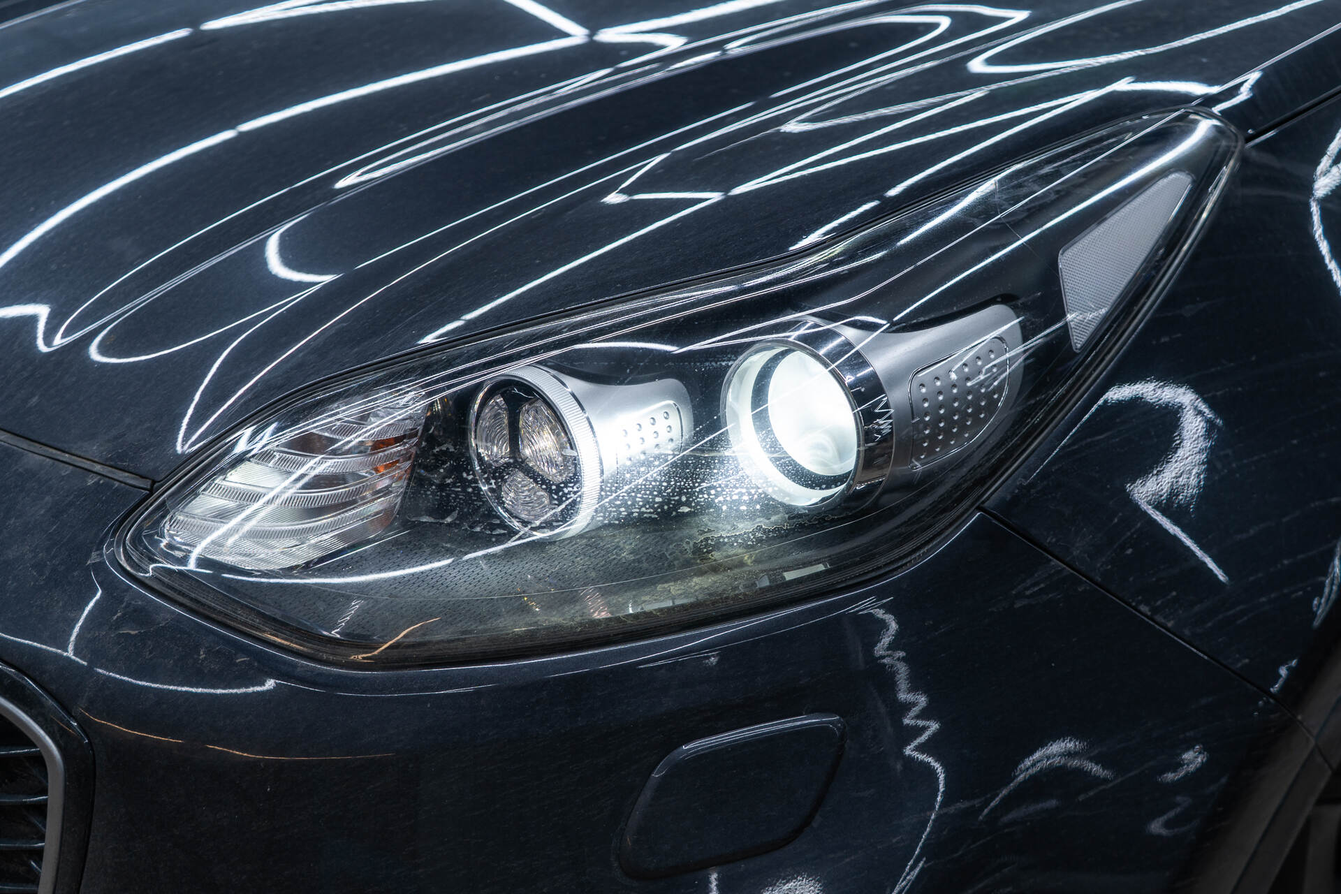 Итоговая светотеневая граница и вид автомобиля после работы.Стоит отметить, что обновленный головной свет кардинально отличается от исходного варианта, с которым автомобиль первоначально поступил к нам в цех. Если ранее свет фар имел желтоватый оттенок и недостаточную плотность, то теперь света реально много, а светотеневая граница стала широкой, с насыщенной структурой с идеально равномерным распределением чистого белого света и минимальной паразитной засветкой. Линзы Vision Tri-led Ultimate Series 5500K в фарах Kia Sportage продемонстрировали отличные эксплуатационные качества — они обеспечивают эффективное освещение дорожного пространства, что многократно повышает комфорт и безопасность ночных поездок. Плюс ярко-белый свет фар отлично смотрится на фоне тёмного кузова, контрастируя и создавая строгий образ автомобилю.