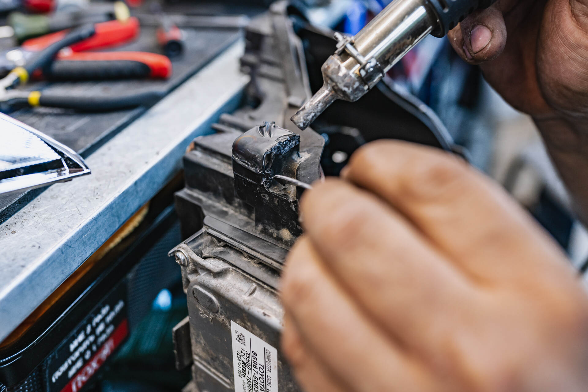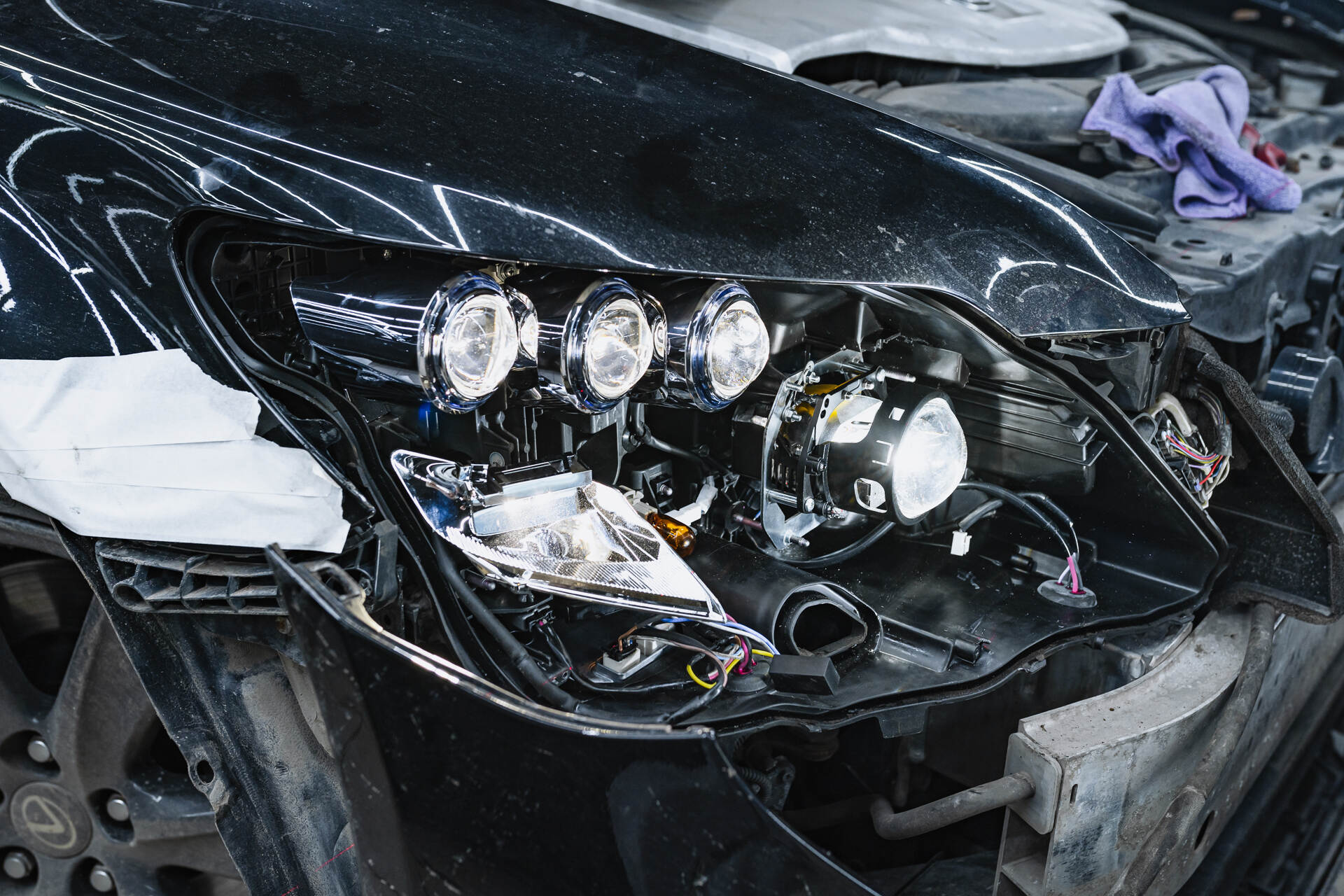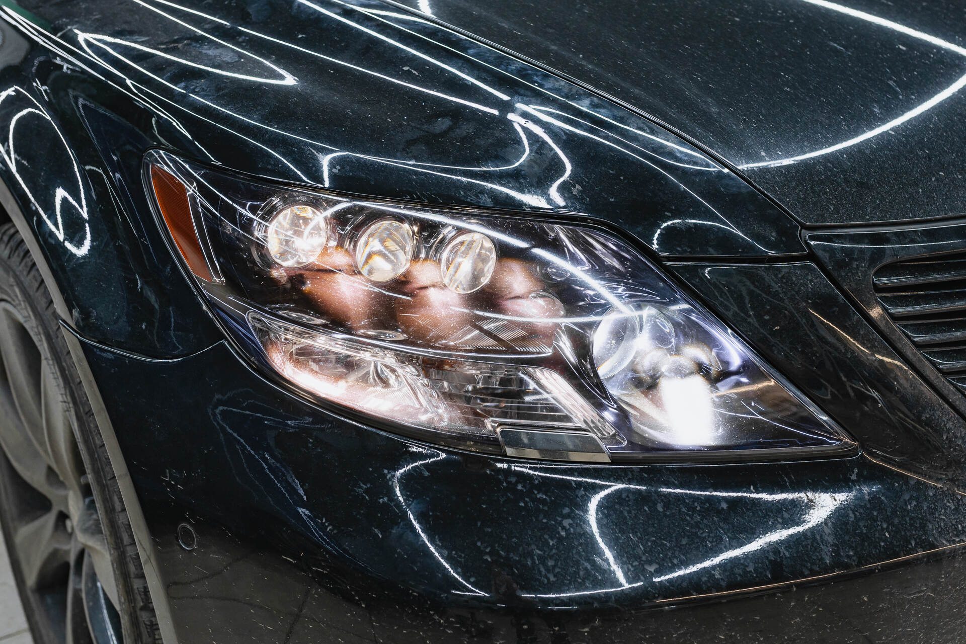 Разбираем фары. Запаиваем трещину в корпусе фары.Замена линз в фарах Лексус ЛС обычно занимает полный рабочий день: автомобиль поступает к нам утром, а к вечеру клиент забирает его с совершенно другим, обновленным автосветом. Работы начинаются с разборки передней части: мы снимаем бампер, демонтируем обе фары и помещаем их в промышленную печь для аккуратной разгерметизации. После вскрытия корпусов из них извлекается старая оптика, а на её место с помощью специальных переходных рамок монтируются новые светодиодные линзы Vision Tri-led Ultimate Series 4300K. Параллельно мы проводим внутреннюю очистку стёкол фар щелочным составом для удаления загрязнений и улучшения светопропускания, а в завершение всей работы выполняем их внешнюю полировку для идеальной прозрачности. Дополнительно мы запаяли довольно крупную брешь в корпусе правой фары.