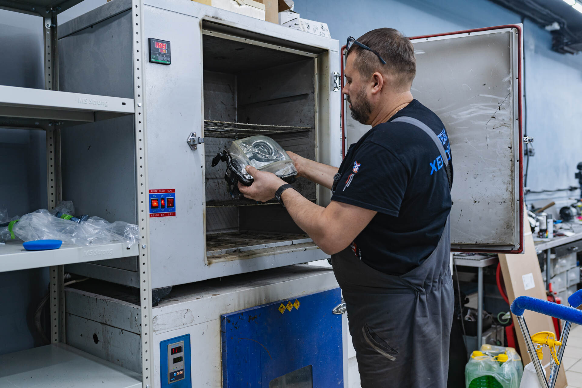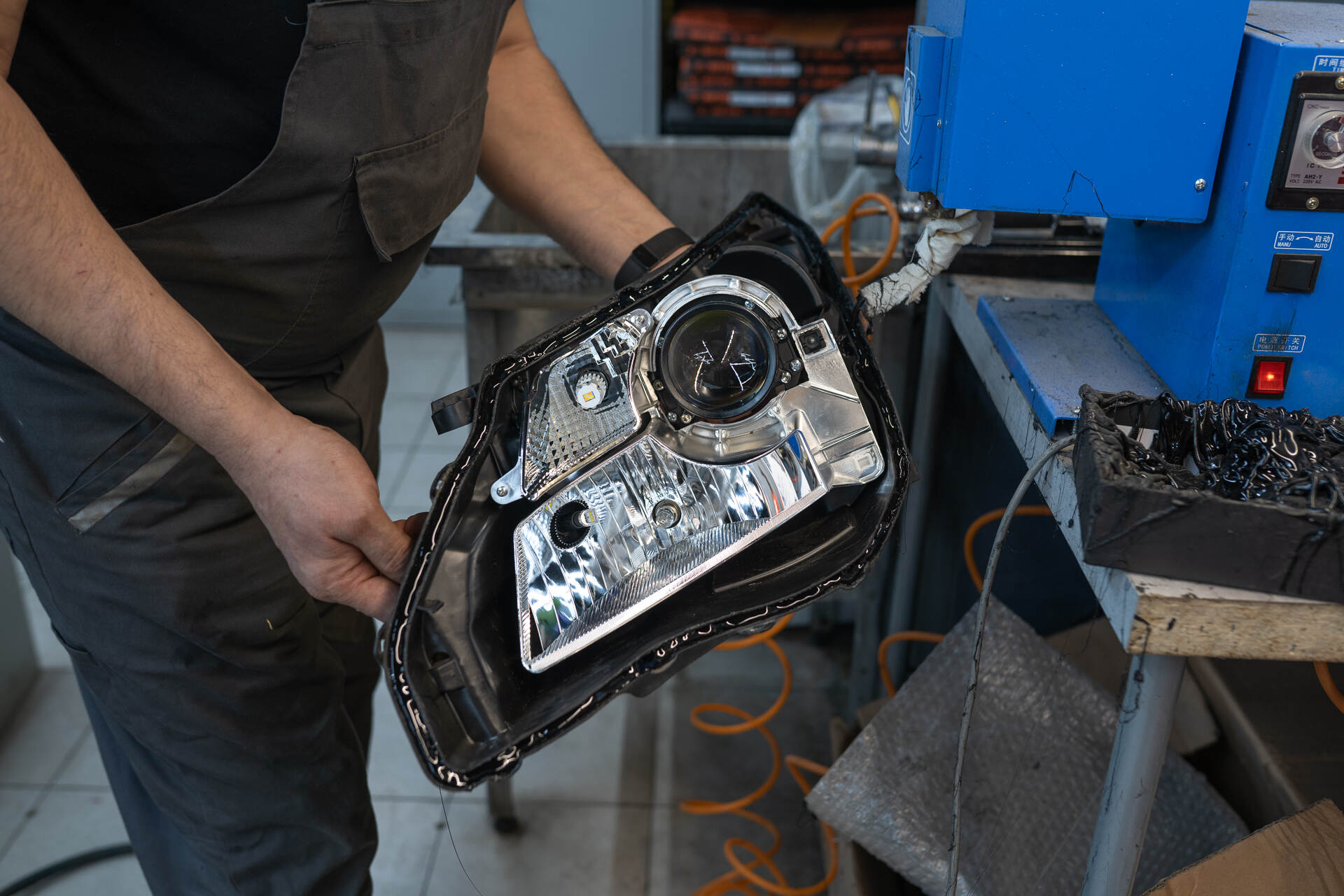Собираем и герметизируем фары.Учитывая возраст автомобиля, мы уделили особое внимание восстановлению стекол фар: изнутри их тщательно очистили щелочным раствором от накопившегося грязевого налета, а снаружи отполировали до зеркального блеска, устранив мелкие царапины и потертости. Завершающий этап включает герметизацию фар бутиловым герметиком и установку фар на штатные места. После финальной сборки мы отрегулировали положение новой оптики по высокоточному прибору, добившись идеальной геометрии светотеневой границы. Теперь работа полностью завершена, и можно оценить превосходный результат.