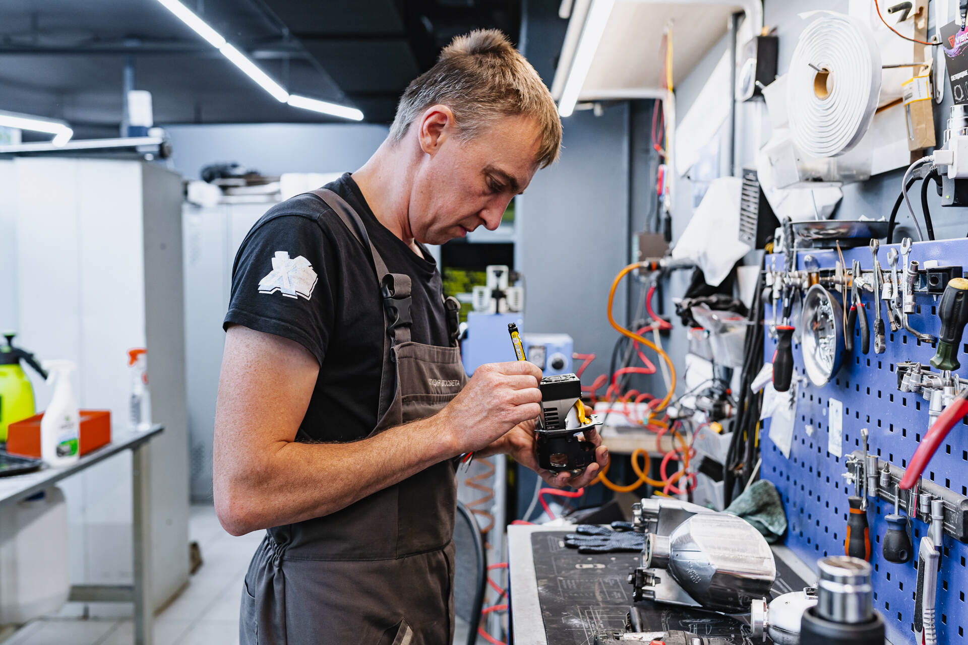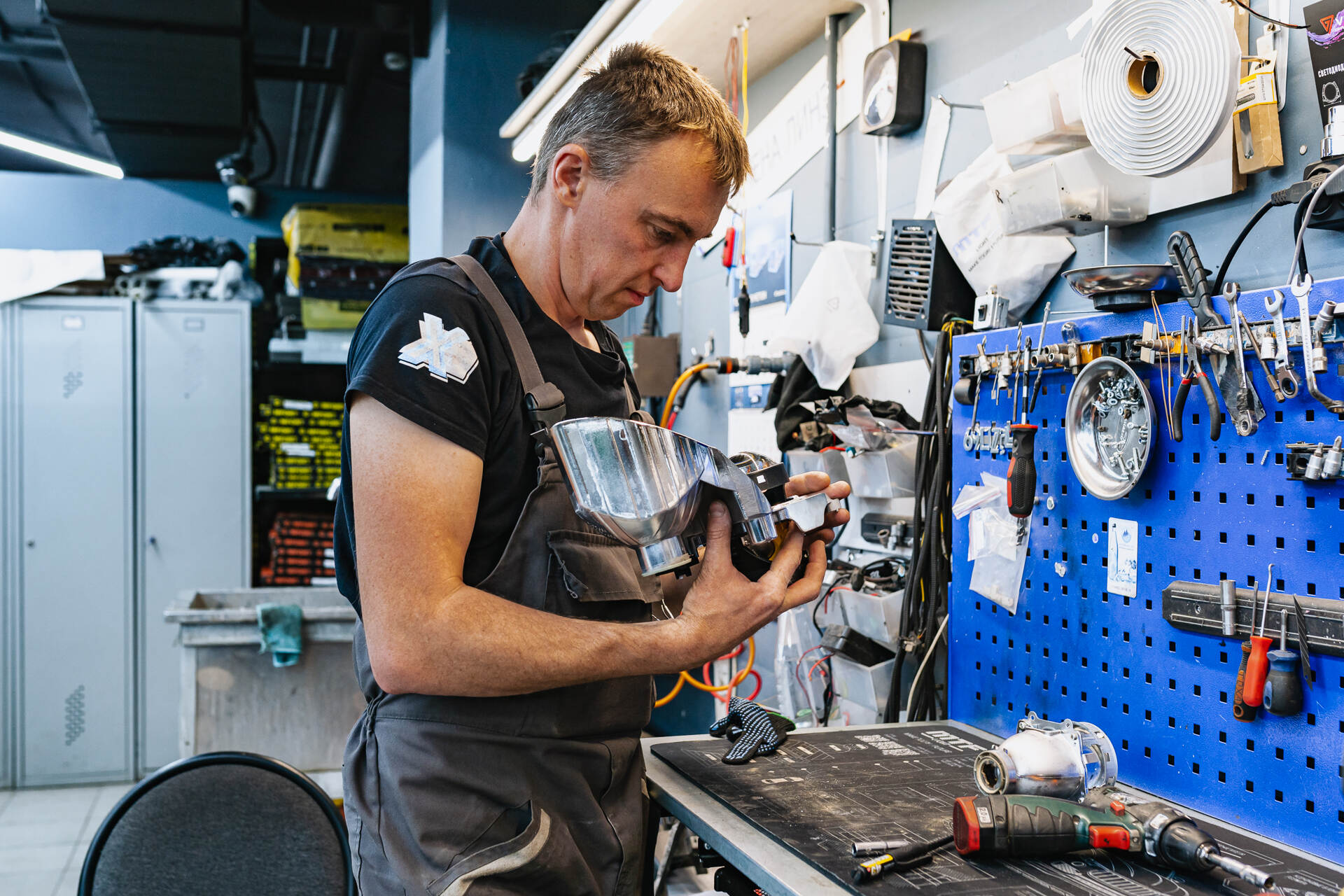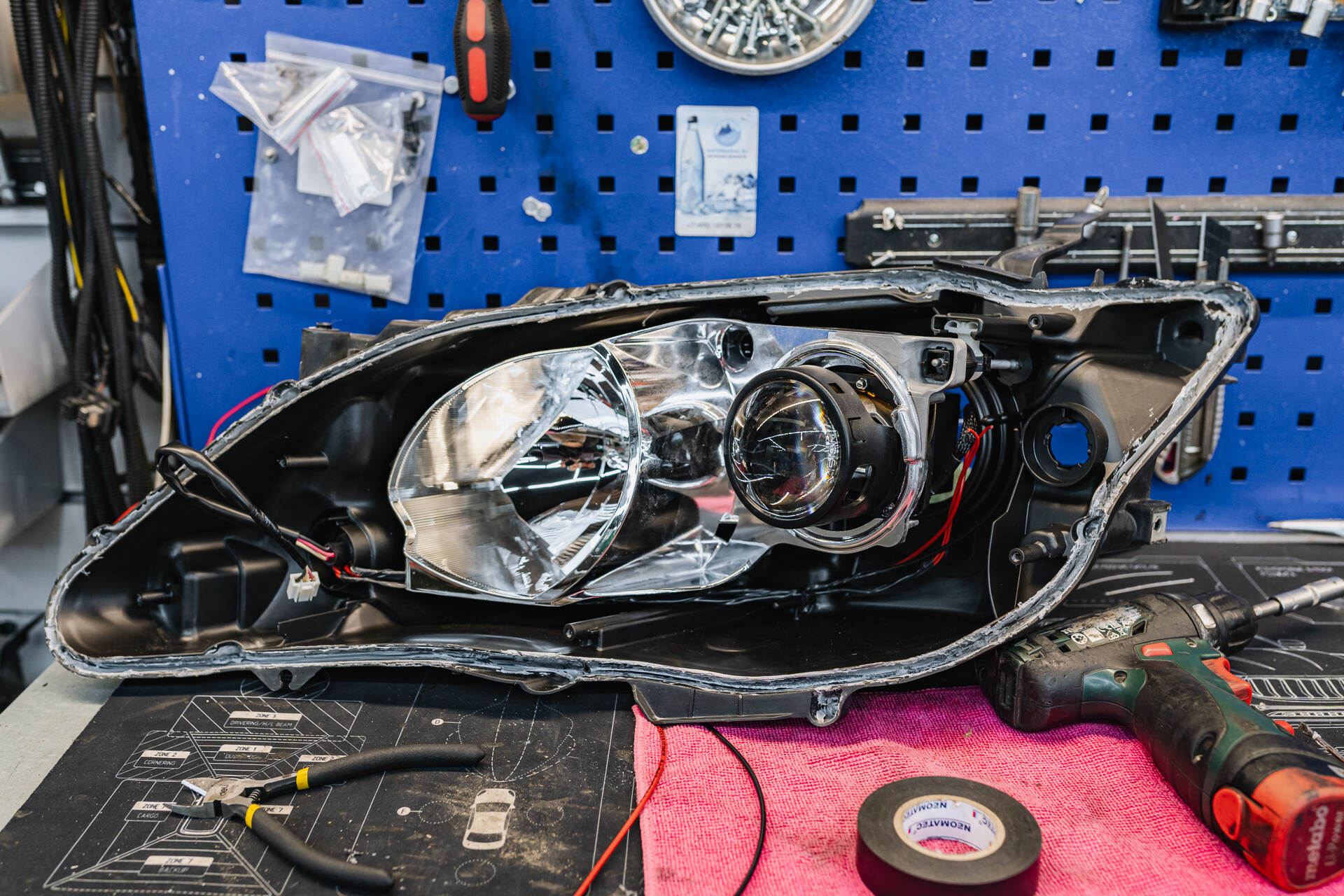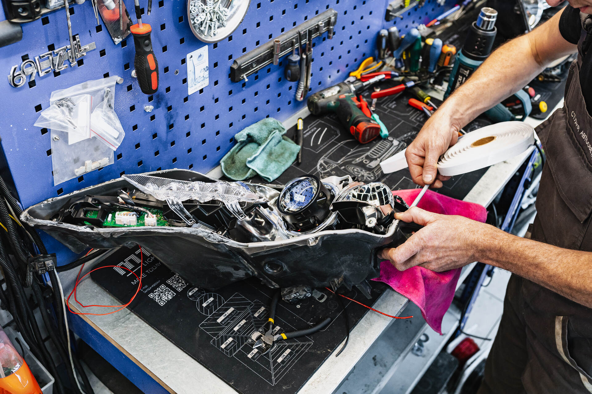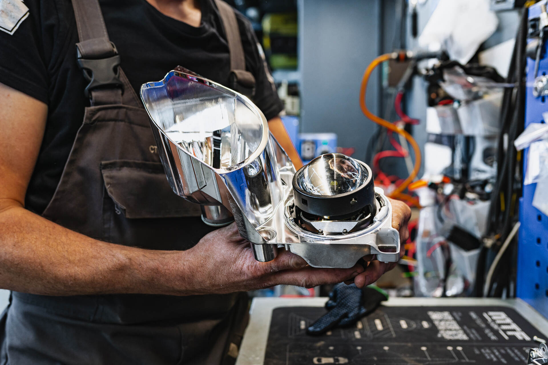 Чистим стекла фар, герметизируем фары и собираем автомобиль.Поскольку штатные стекла фар имели значительное помутнение, мы выполнили их внутреннюю очистку щелочным составом и внешнюю полировку абразивными пастами, что значительно улучшило светопропускание оптики. После установки линз фары тщательно герметизируются бутиловым герметиком, и после полимеризации герметика автомобиль собирается. Завершающим этапом становится точная регулировка светодиодных линз Vision Avantgarde с по прибору, обеспечивая тем самым оптимальное распределение светового пучка на дороге.