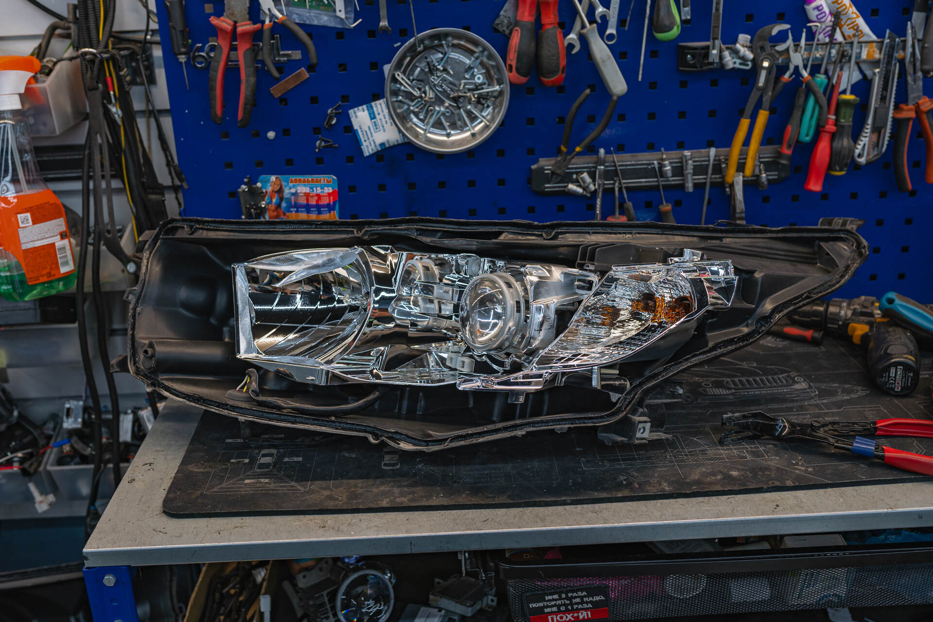 Регулируем свет фар до их герметизации. Собираем фары и полируем их стёкла.В процессе работы мы тщательно очистили внутреннюю поверхность стекол щелочью, что крайне важно для автомобилей с большим пробегом – эта процедура эффективно устраняет многолетние наслоения грязи, восстанавливая прозрачность и гарантируя прохождение светового потока от новых линз без искажений. После замены герметика и окончательной сборки автомобиля мы приступаем к финишным этапам. Мастера полируют внешнюю сторону стекол для удаления мелких дефектов и проводят точную регулировку фар по прибору, добиваясь идеально ровной светотеневой границы для безопасного и комфортного вождения.