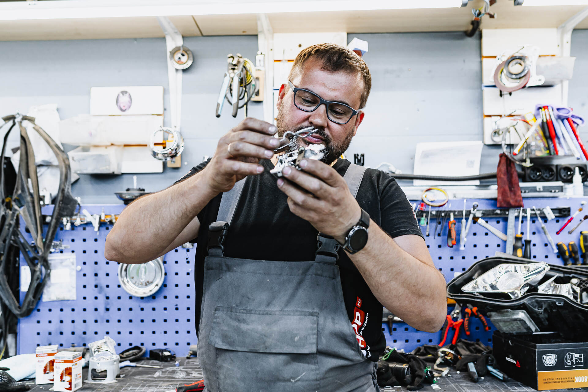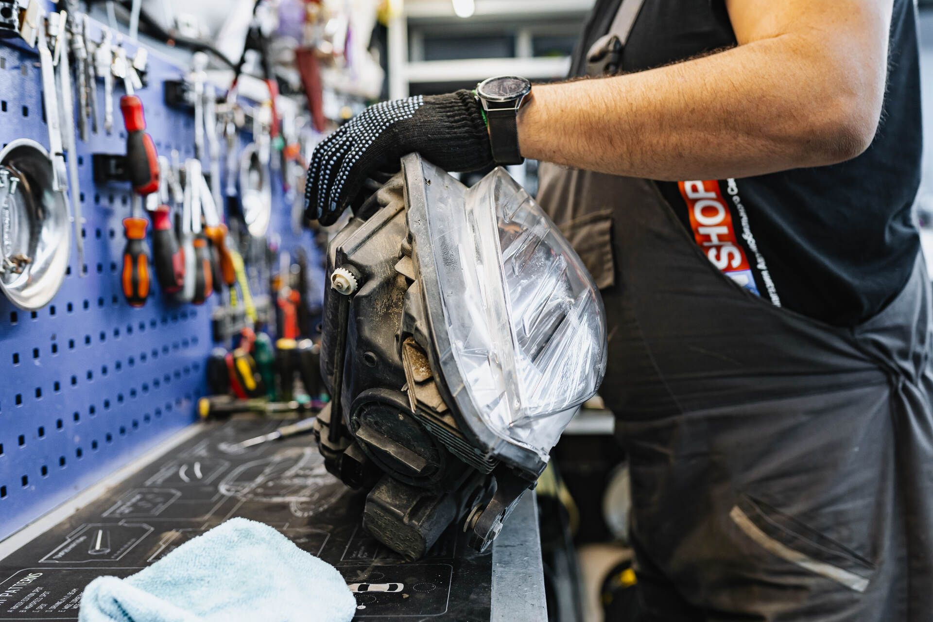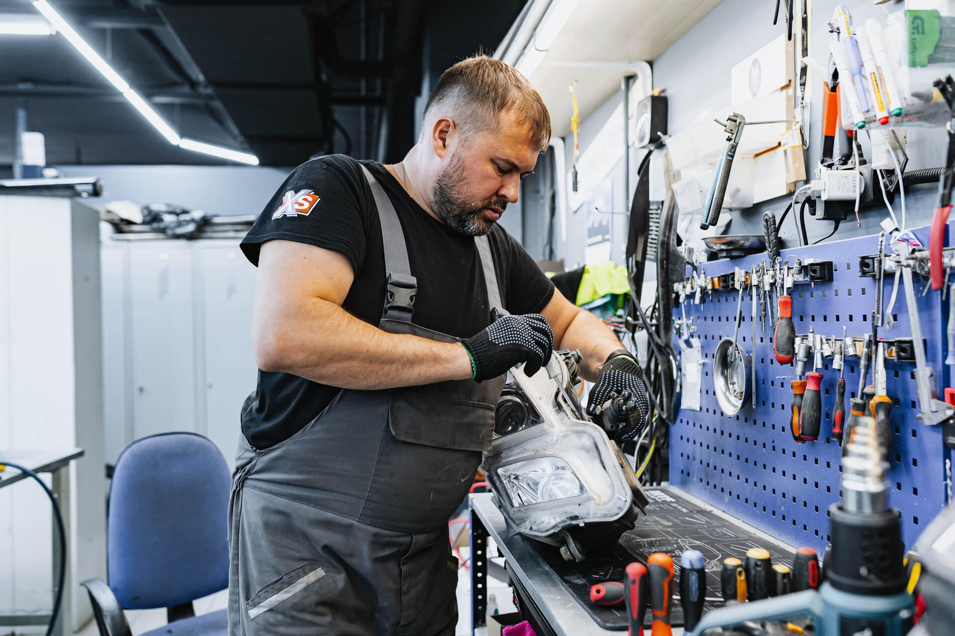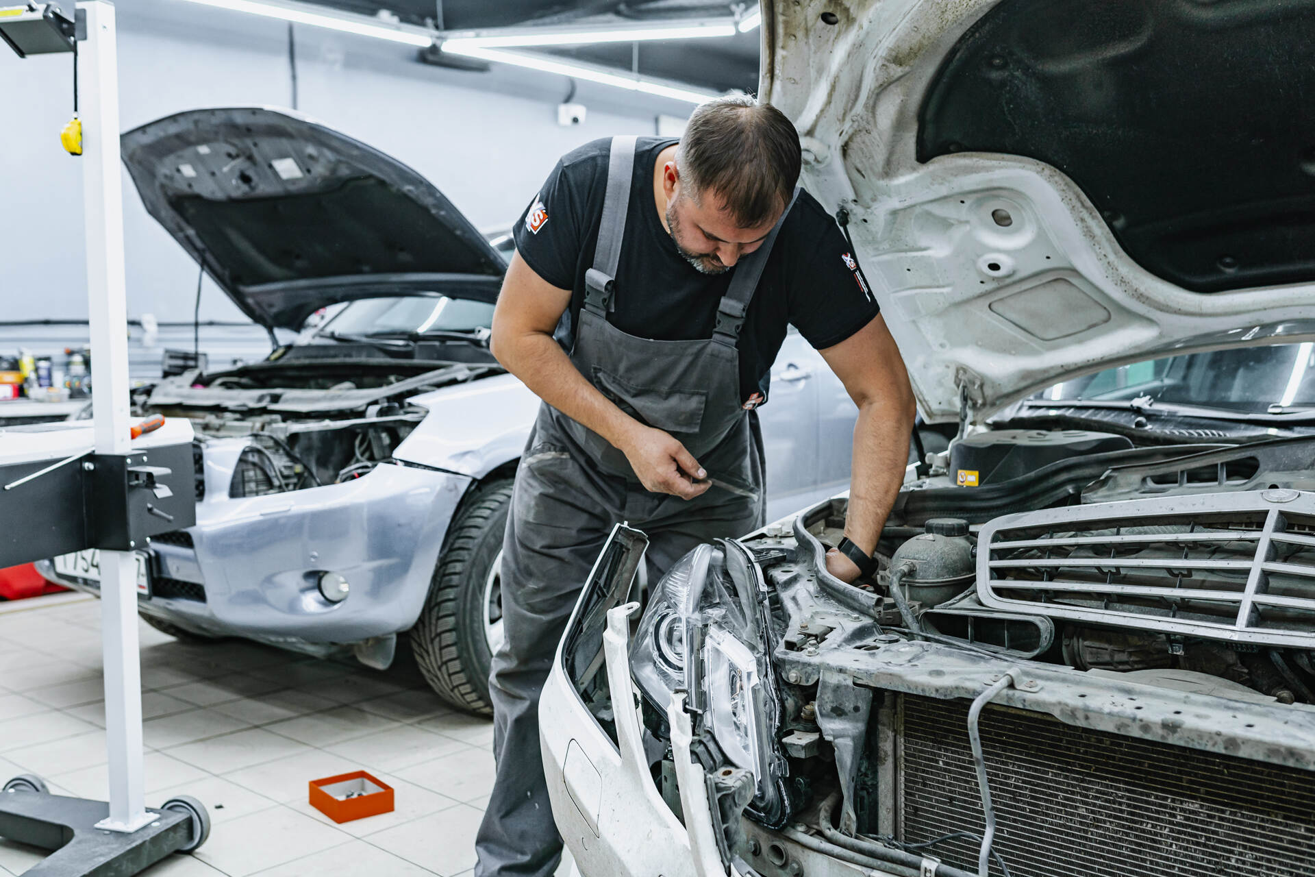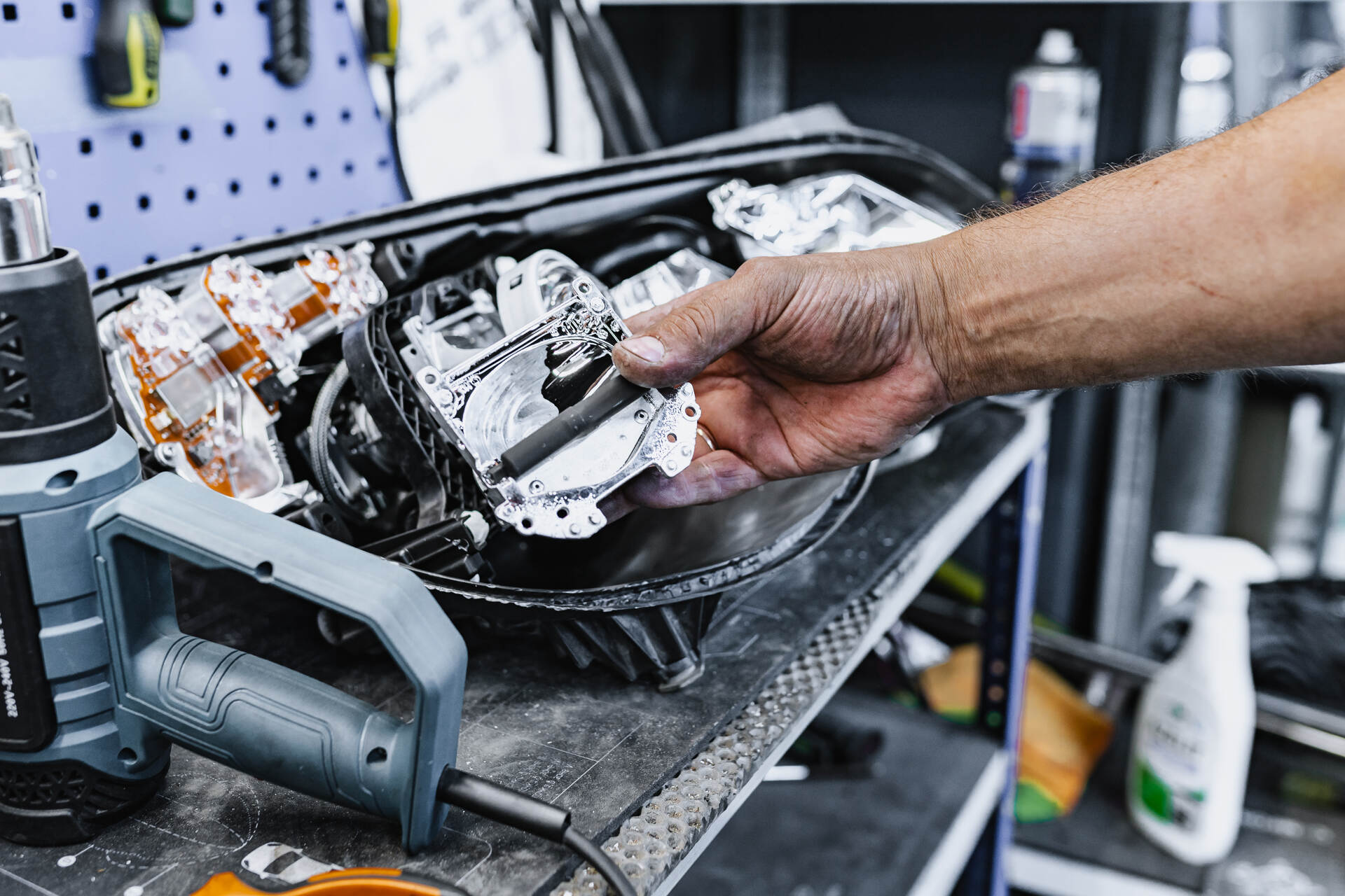 Разбираем фары после демонтажа. Меняем отражатели в линзах.Для замены отражателей линз Мерседес 212 требуется разобрать переднюю часть автомобиля: снимаем бампер, извлекаем фары и отправляем их на разборку. После аккуратного вскрытия и удаления штатного герметика мы извлекаем заводские линзы, заменяем в них отражатели и возвращаем модули на место. Параллельно мы тщательно очищаем внутреннюю поверхность стекол фар щелочным составом, удаляя накопившиеся загрязнения — это позволяет существенно увеличить светопропускание по сравнению с неочищенной оптикой.