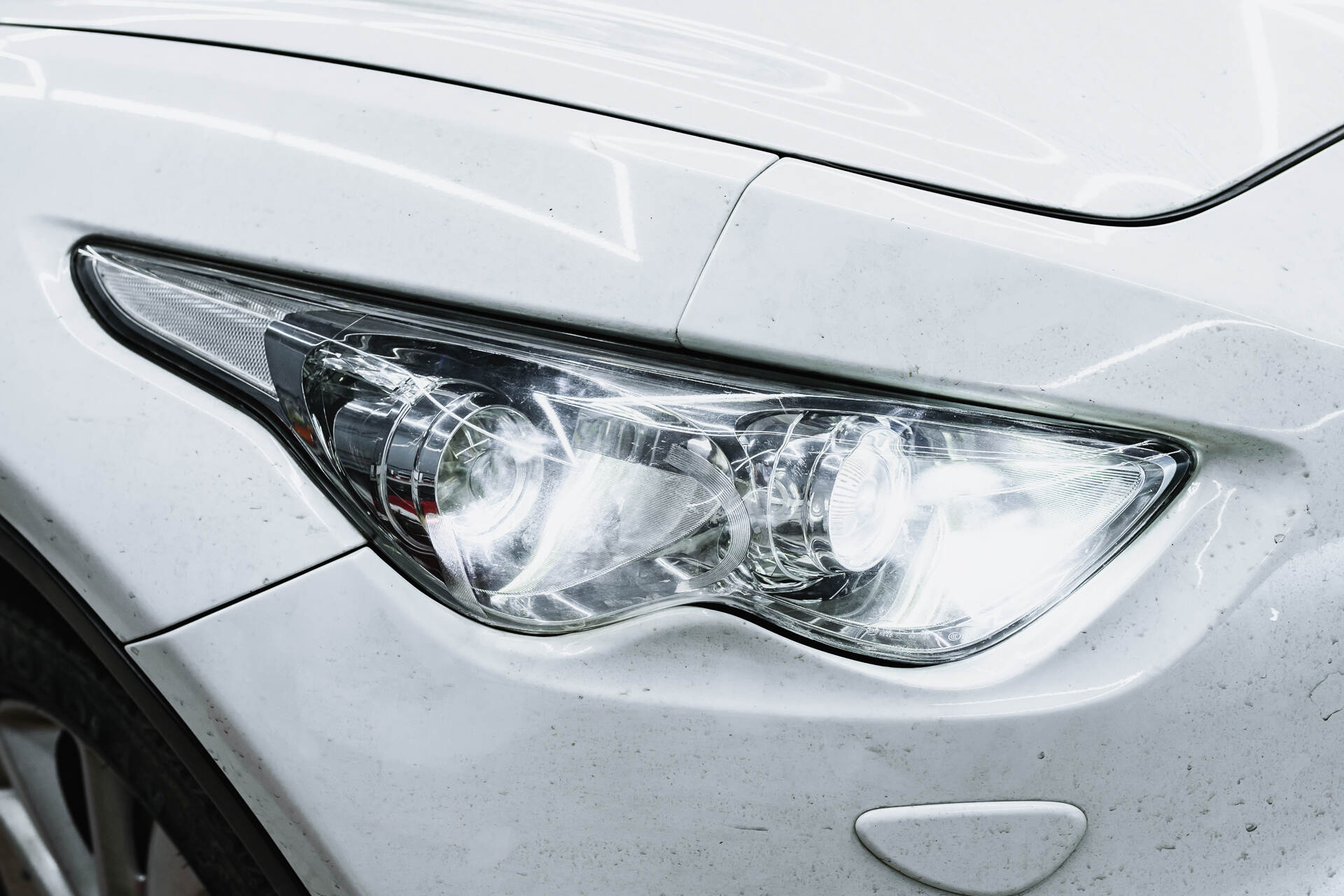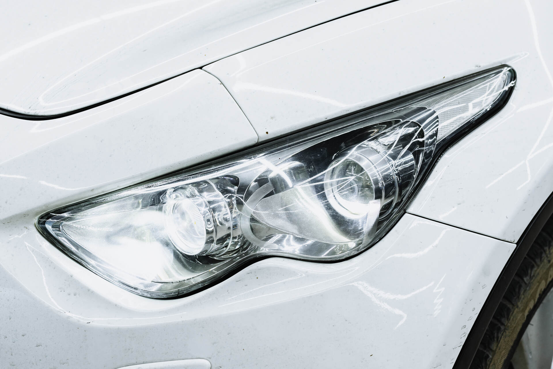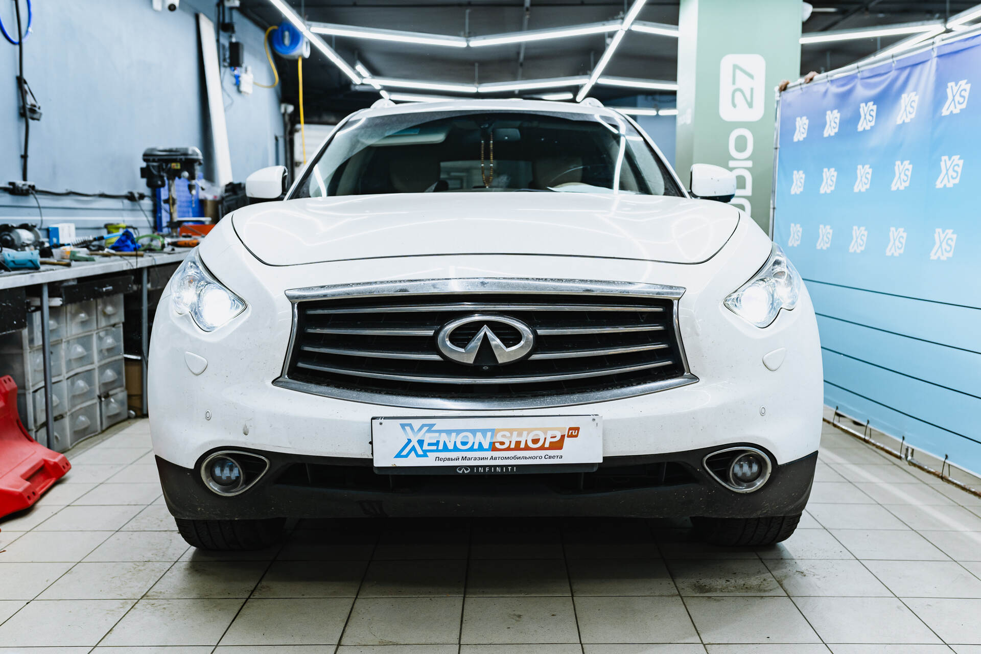 Чистим стёкла фар, герметизируем и регулируем световой поток по прибору.Оценим итоги проведенной работы. Финальные фотографии Infiniti FX34 (2012) наглядно демонстрируют превосходные характеристики светодиодных линз Vision TRI-LED Ultimate Series Soft 4800K. Сформированная светотеневая граница отличается исключительной плотностью и интенсивностью, сохраняя идеальную геометрию – она ровная и с равномерной заливкой светом. Минимальный уровень бокового рассеивания гарантирует, что новая оптика не будет слепить встречных автомобилистов. Внешний вид автомобиля после тюнинга головного света также заслуживает внимания — яркое белое свечение органично сочетается с белым кузовом, повышая уровень эстетики до максимума. Однако ключевым результатом остается обеспечение безопасных условий ночного вождения, что особенно значимо в зимний период при сложных погодных условиях и ранних сумерках.