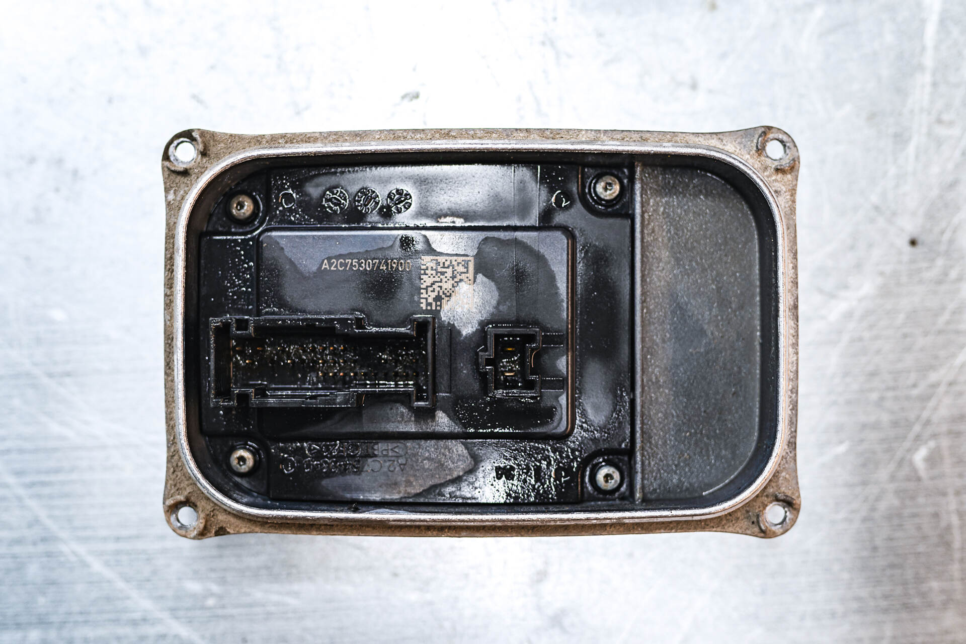 В нашем автосервисе ремонт запотевших фар является одной из самых востребованных услуг после замены ламп и линз. Хотя эта проблема относится к числу типичных, ее причины могут быть самыми разнообразными: от повреждения герметика и появления трещин до конструктивных просчетов на этапе производства автомобиля. На этот раз мы работали с Mercedes-Benz GLE W167 (2019), у которого правая фара значительно запотела и была заполнена конденсатом из-за образовавшейся довольно-таки крупной трещины на стекле фары. Наша задача – заменить треснувшее стекло фары, а также попытаться реанимировать блок управления светом, который сильно залило влагой из фары (блоки расположены снизу корпуса фар). Собственно, как раз главной опасностью запотевания фар является скопившаяся влага, которая может попасть на блоки управления освещением и вывести их из строя, поэтому мы не рекомендуем откладывать диагностику, в случае если заметили внутри фары конденсат.