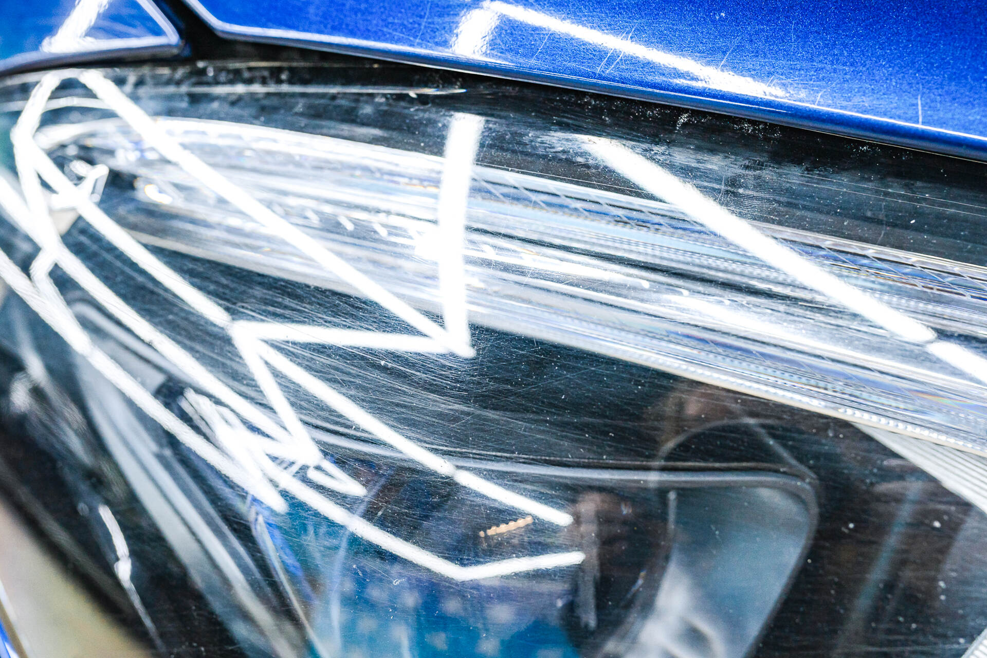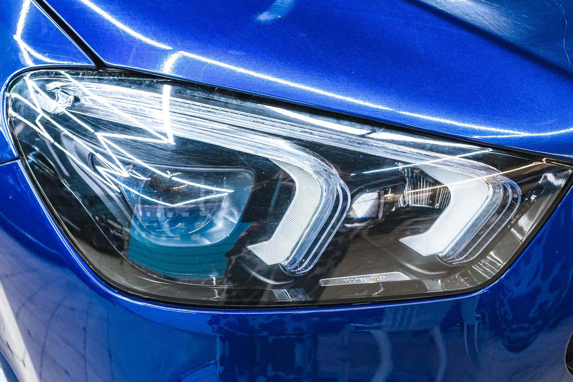 Владелец автомобиля Mercedes-Benz GLE W167 (2020) привез автомобиль в наш автосервис с довольно многочисленными потёртостями на правой фаре, которые могли образоваться после притирки с другим автомобилем. При этом фара периодически запотевала, что также необходимо исправить, ведь со временем скопившаяся влага неизбежно достигнет электронных компонентов (блок розжига, проводка), расположенных в нижней части фары, что приведет к выходу из строя блока управления освещением и сопутствующей электропроводки. На момент осмотра конденсат уже испарился, однако повреждение стекла оставалось очевидным. Нашей задачей стала замена треснувшего стекла на новое — мы всегда располагаем стеклами фар для распространенных моделей автомобилей, что позволяет оперативно выполнить такой ремонт.