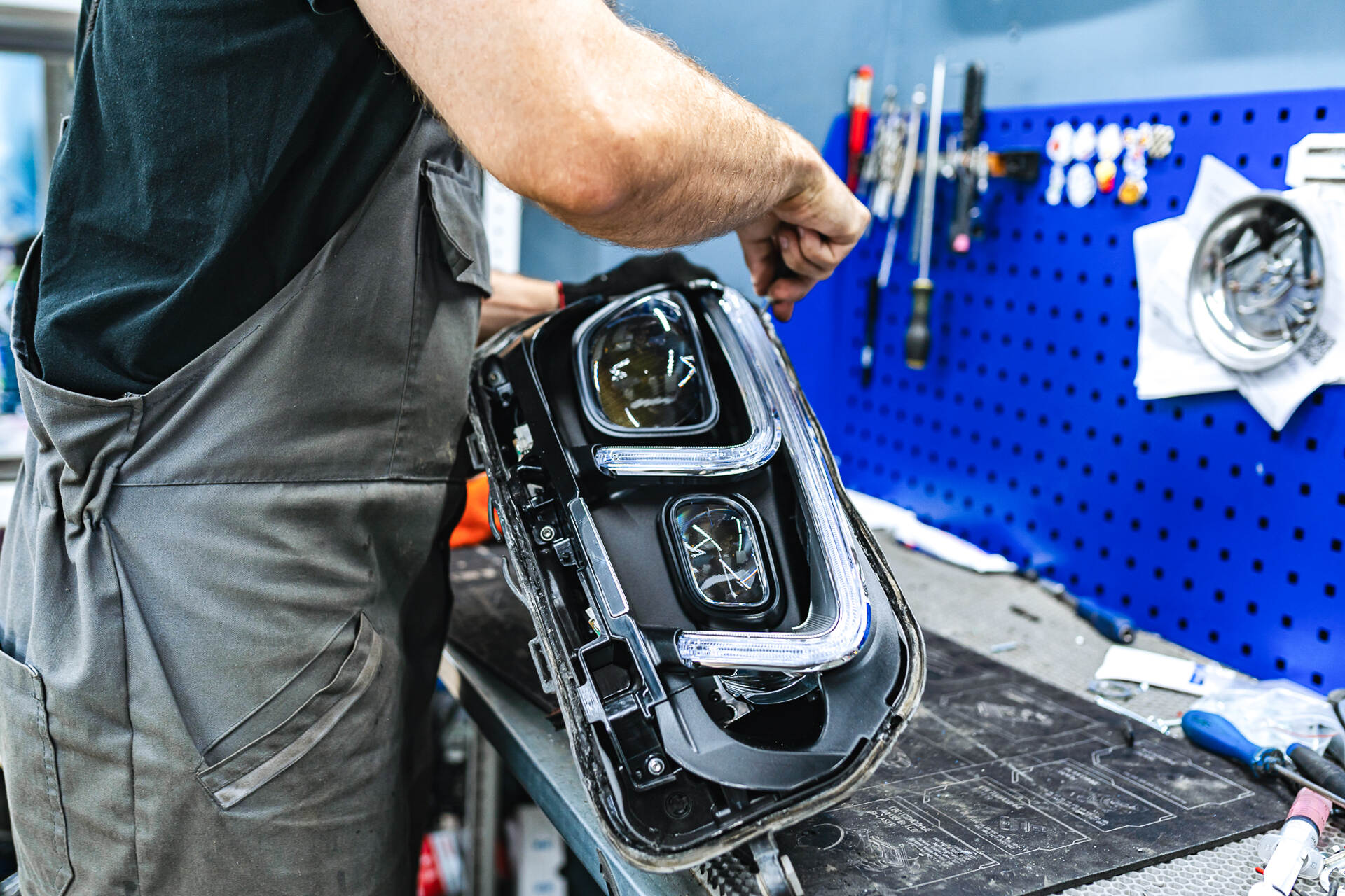 Демонтируем, дефектуем и разбираем фару.Замена стекла правой фары Мерседес ГЛЕ 167 занимает несколько часов, и в первую очередь мы проводим дефектовку фары, чтобы понять место разгерметизации – в нашем случае подозрения подтвердились, и виной всему стало именно стекло фары. Разбор фары требует некоторого времени, так как производитель использовал специальный стекольный герметик, делающий оптику неразборной, что исключает возможность стандартной разборки в промышленной печи. После удаления старого стекла мы тщательно зачистили посадочную поверхность от остатков герметика, нанесли новый бутиловый герметик в монтажные пазы и провели герметизацию фары с установленным новым стеклом.