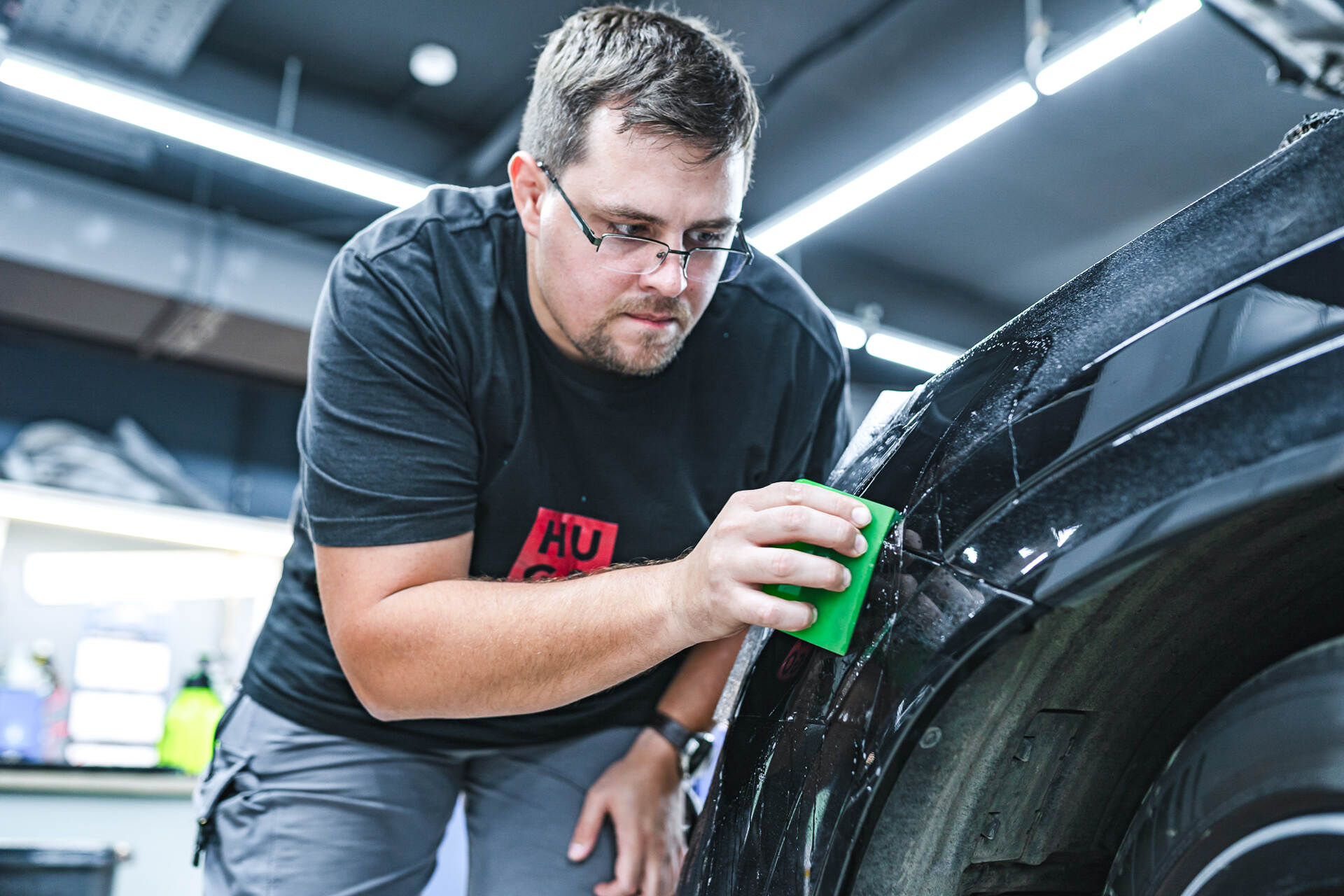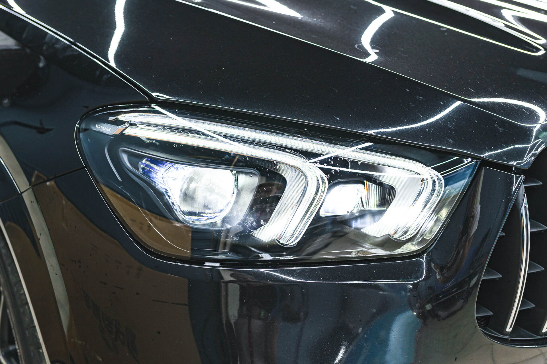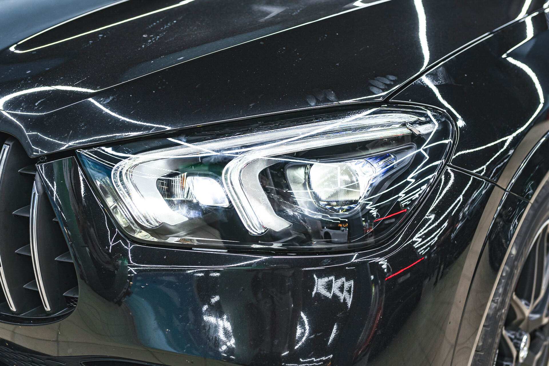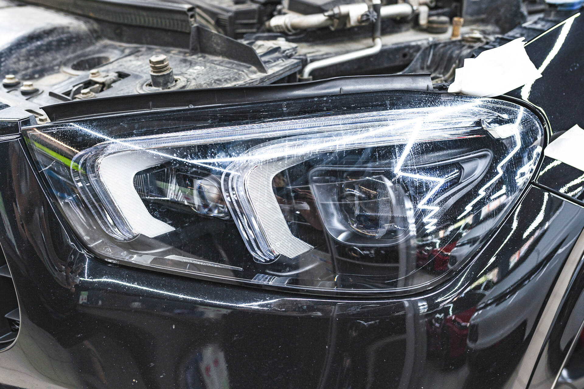 Оклеиваем бронёй новые стёкла фар.Дополнительно мы забронировали новые стёкла фар Mercedes-Benz GLE W167 полиуретановой плёнкой, чтобы защитить их от пескоструя и мелкой щебенки, вылетающей из-под колёс впередиидущих автомобилей – так стёкла фар прослужат значительно дольше и не будут покрываться царапинами и мутнеть. Итоговые фотографии наглядно подтверждают: после замены стекол фары обеспечивают полноценное освещение при любых условиях видимости. Кроме функционального улучшения, новая оптика визуально омолаживает экстерьер автомобиля, возвращая ему первоначальную выразительность.